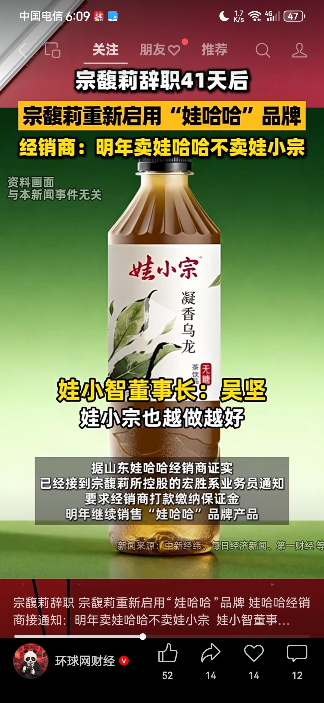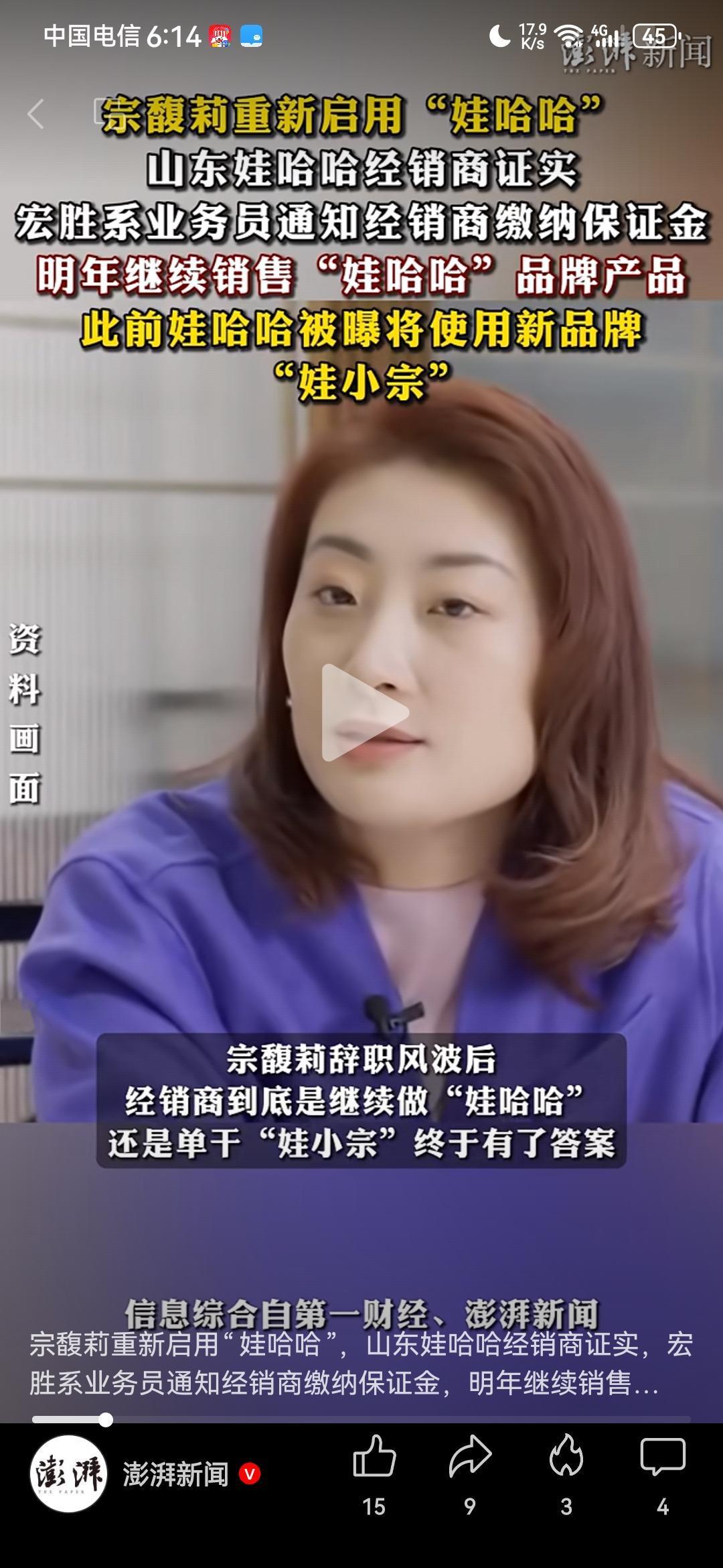 娃哈哈宗馥莉最新消息来了!根据环球网财经10月24日报道,宗馥莉在辞职41天后,竟然决定重新启用“娃哈哈”品牌!在这之前,宗馥莉向娃哈哈集团辞去董事长的职务后,便试图经营一个全新品牌“娃小宗”,与此同时宗馥莉的叔叔宗泽后也启用了一个新品牌“娃小智”,显然是要拿这个与宗馥莉打擂台,双方都要经营一个新品牌,但是手里动用的资源肯定还是原来娃哈哈集团的资源,如果真的要是这样发展下去,娃哈哈集团多半也会因此受到冲击,人们都很担心这一点。 可现在,情况终于变了,宗馥莉已经做出了决定,还是继续要继续经营“娃哈哈”,根据报道,现在山东娃哈哈的经销商就已经接到宗馥莉控股的宏胜系业务员的通知,要求他们“打款缴纳保证金,明年继续销售娃哈哈品牌产品”。毫无疑问,这是大好事,证明宗馥莉至少并没有放弃娃哈哈品牌,这个国民品牌接下来还能继续正常经营下去。实际上,这或许也是一个更加理智的选择,毕竟现在饮品市场竞争非常激烈,若是没有“娃哈哈”这个名头,又怎么可能做得起来呢? 大家对于“娃哈哈”都还是很有感情的,这是中国少有的一个国民品牌,希望宗馥莉无论如何都要努力把这个品牌继续延续下去!