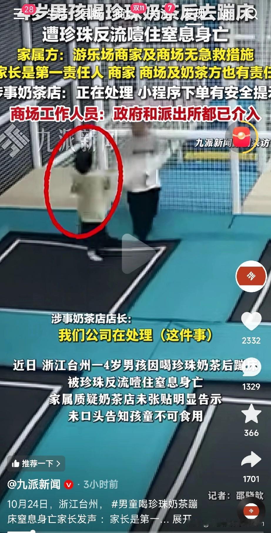 4岁男童窒息,谁之过? 痛心! 浙江台州,一个4岁的小生命,因为一杯珍珠奶茶和一次蹦床玩耍,永远离开了。 事故过程让人后怕:孩子喝完奶茶去玩蹦床,结果珍珠反流堵塞气管,最终导致窒息身亡。 家属悲痛之余,质疑奶茶店“未张贴明显告示,未口头告知”。而店方表示小程序下单有提示,目前各方已介入处理。 但评论区这次却“翻了车”,网友们的观点几乎一边倒: “奶茶是你买的,游乐场是你带去的,孩子的命,是谁弄丢的?” 这句话听着刺耳,却点破了一个残酷的现实:为人父母,安全这根弦,一刻都不能松。 奶茶里的珍珠,Q弹好吃,但对幼童就是潜在的“气道杀手”。 进食后蹦跳嬉戏,本就是安全大忌,极易引发反流和呛噎。 警示所有的家长: 吃喝与玩耍,必须严格分开! 特别是果冻、坚果、珍珠奶茶等食物后,务必让孩子安静休息。 孩子的安全,没有“我以为”。 不能指望商家事无巨细的提醒,父母的预判和监管,才是孩子最牢固的安全带。 学会海姆立克急救法! 关键时刻,这是能从死神手里抢时间的救命技能。 一个生命的代价太沉重。希望这场悲剧,能敲响所有家长心中的警钟。 保护孩子,别等出了事,才想起追责别人。 朋友们怎么看?你觉得在这起事件中,主要责任在谁? (文章素材来自九派新闻,侵删)