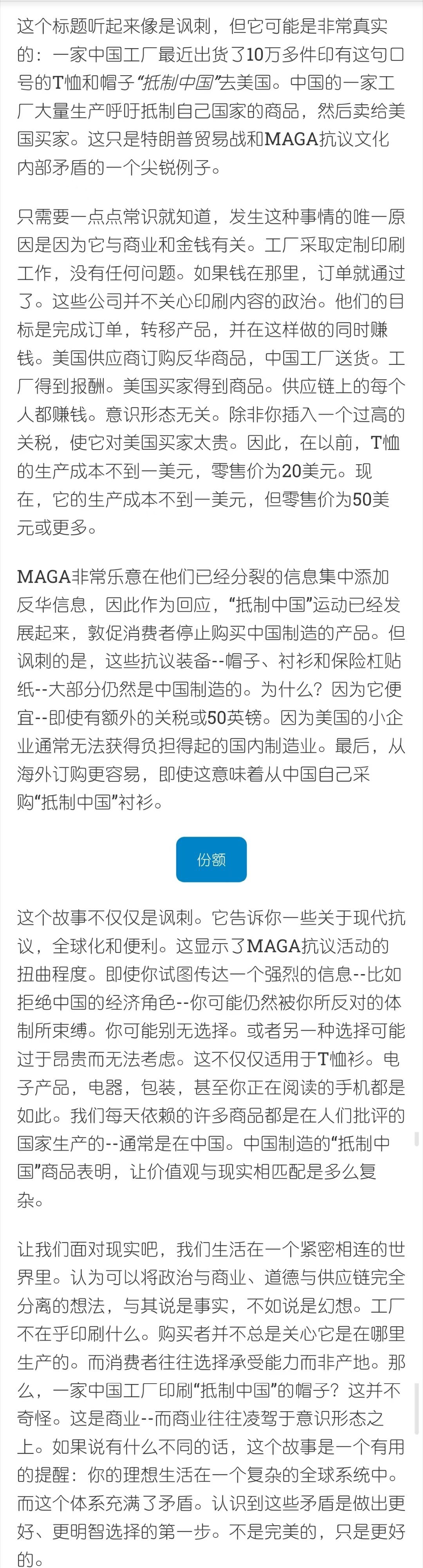 美国想生产印有“抵制中国”的T恤,但是美国本土的工厂要么无力生产,要么生产成本过高,最后美国把这批印有“抵制中国”T恤的订单,交给中国的服装厂生产。