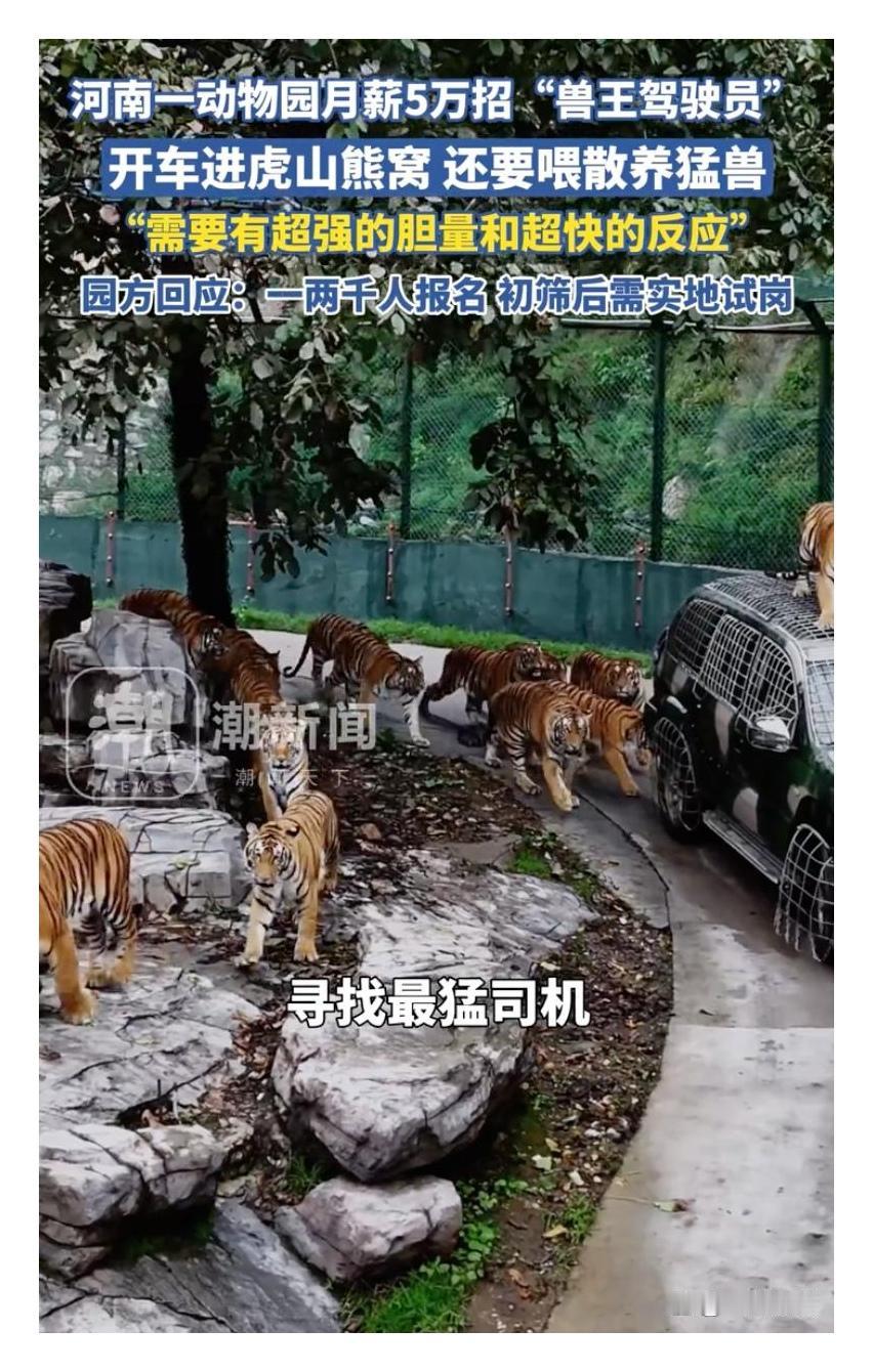 大家刷到了吗? 河南一动物园出月薪5万招聘猛兽区司机,主要职责是开车进虎山熊窝,带游客直面兽王怒吼。 这待遇够猛够吸吸人的。出这样的薪资,肯定考虑到职业的风险因素。就这样的职业,据园区回应,报名人数还特别多呢。 我就想了,花这么高的薪资去招人,还不如购买无人驾驶车辆或无人机去给猛兽送饭、送游客呢,既省钱又安全。 顺便问一下,上一任司机去哪了呢?是辞职了,还是遇到啥事了呢。 个人观点,仅供参考!