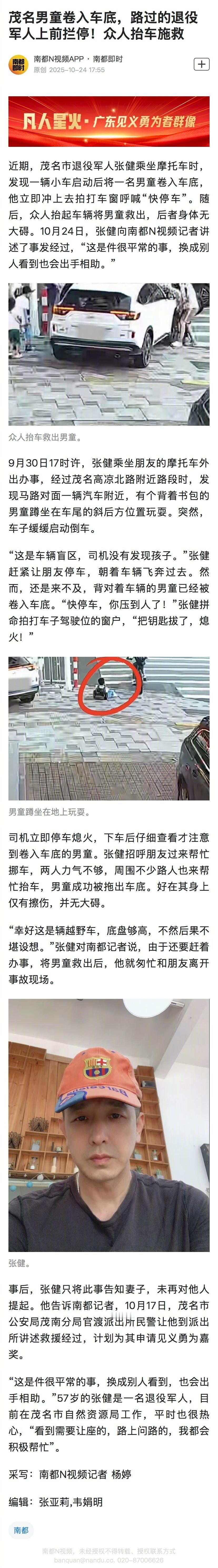众人抬车救出卷入车底男童【茂名男童卷入车底,路过的退役军人上前拦停!众人抬车施救】退役军人路遇男童卷入车底冲了上去近期,茂名市退役军人张健乘坐摩托车时,发现一辆小车启动后将一名男童卷入车底,他立即冲上去拍打车窗呼喊“快停车”。随后,众人抬起车辆将男童救出,后者身体无大碍。10月24日,张健向南都N视频记者讲述了事发经过,“这是件很平常的事,换成别人看到也会出手相助。”