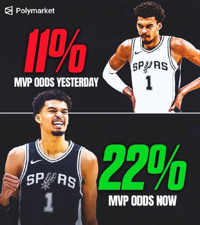 文班亚马获得本赛季MVP的概率已经从11%翻倍到22%…… NBA开赛以来,有太多人打出炸裂表现,例如库里、戈登、亚历山大、爱德华兹,但整体上,都不如文班亚马这一场球来的震撼。 这是一个2米26,臂展2米50以上的中锋带来的观赛体验,投三分,大变向,后场持球一条龙,浓眉也算是内线防守大闸,结果被文班打成了新兵蛋子。 这就像以前没人像库里那样投三分一样,大家也没见过像文班亚马这么打球的人,场面过于离谱。 因此,即便“一场论”非常不靠谱,但大部分看完这场球的人,都会认为文班亚马已经有资格去竞争MVP了。