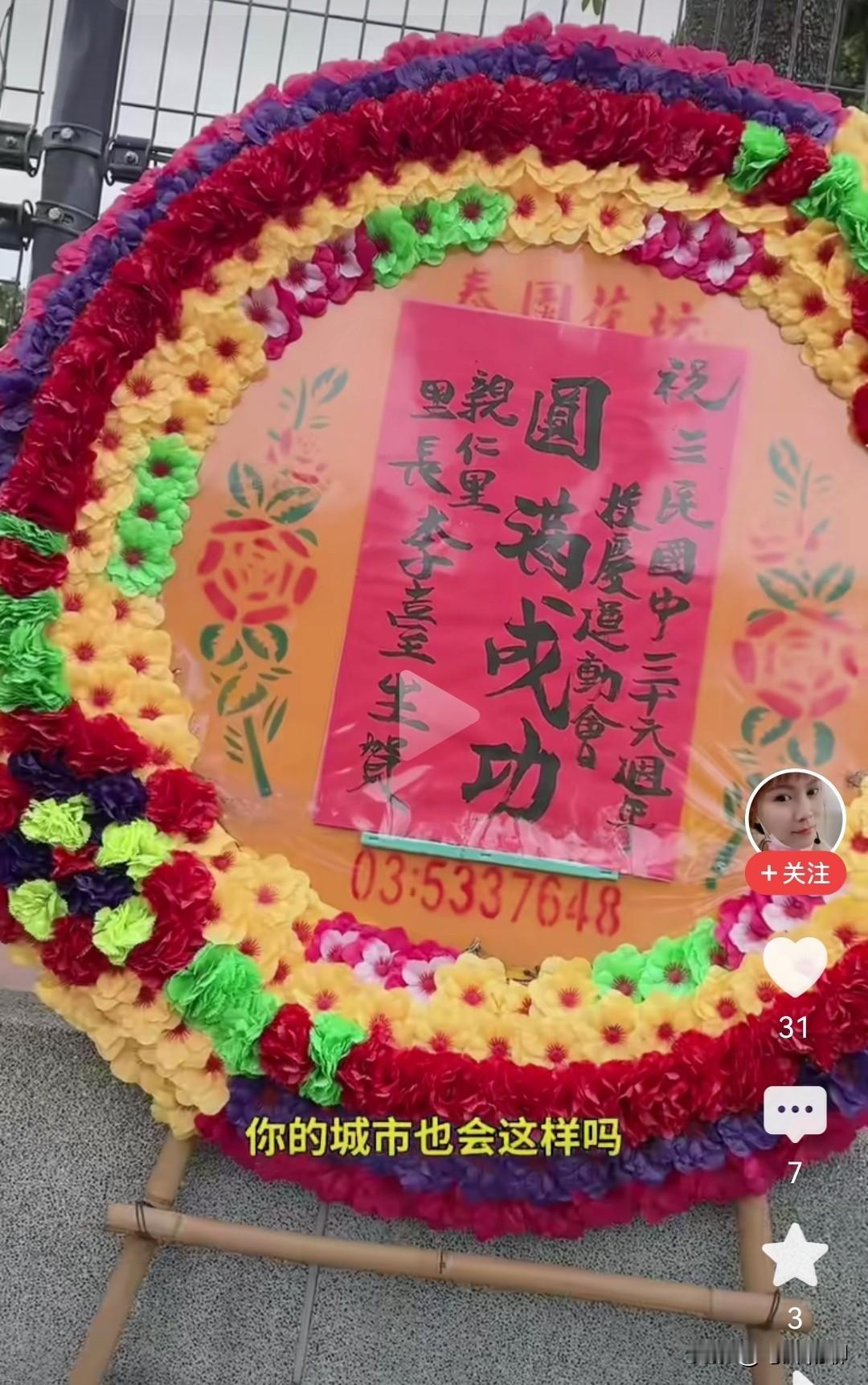 台湾和大陆在文化上属于一脉相承,文化大同小异,可两岸分开久了,难免也会存在一些差异。比如说,咱们这边过白事送花圈,过红事可以送鲜花,也可不送,而台湾地区结婚或庆祝活动都会送这种鲜艳的花圈。 没想到吧,和咱们的文化习俗居然差别这么大,也不知道他们原来就有这种习俗,还是后面受日本的影响才有的,知道的朋友评论区说说!(图片来自网络)台湾风土人情 台湾仪式 台湾省民族文化 两岸节日差异 台湾省人土风情 台海传统文化
