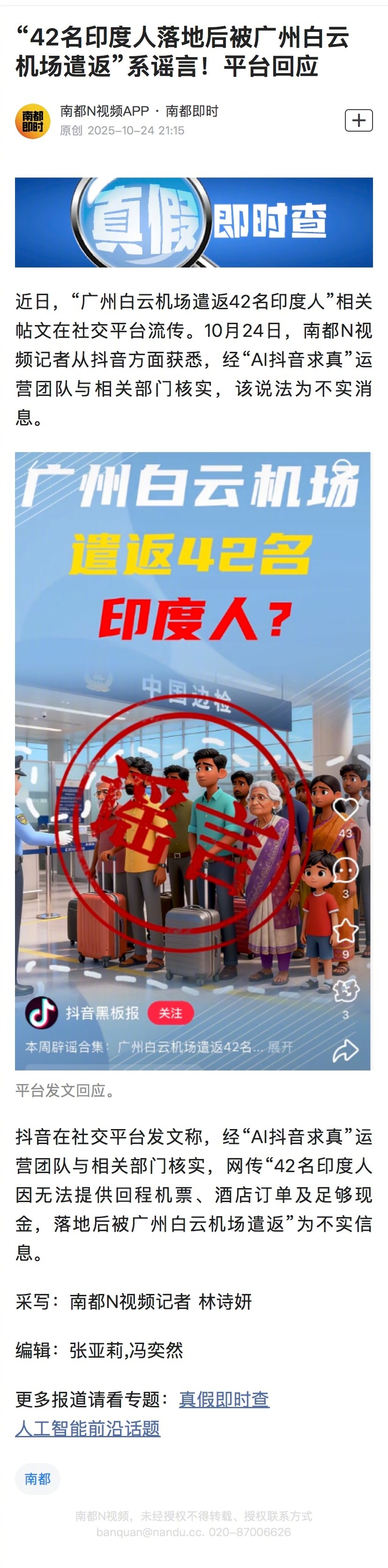 #网传广州遣返42名印度人系谣言#【“42名印度人落地后被广州白云机场遣返”系谣言!平台回应】近日,“广州白云机场遣返42名印度人”相关帖文在社交平台流传。10月24日,南都N视频记者从抖音方面获悉,经“AI抖音求真”运营团队与相关部门核实,该说法为不实消息。