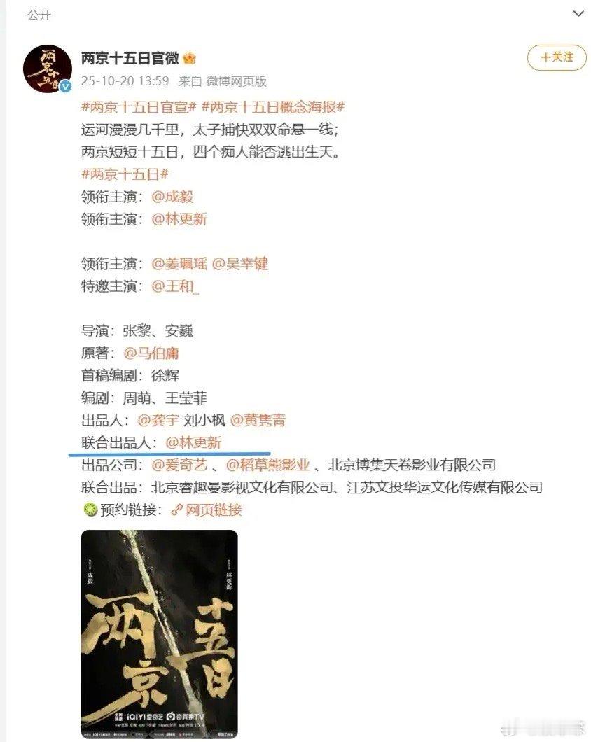 《两京十五日》从官宣成毅、林更新主演后,我就知道会有自媒体引战,番位就是最好的引子,我去看了官宣海报,林更新是主演、也是出品人,这说明林更新已经是老板了,那个老板会嫉妒自己的员工优秀?所以,林现在根本就不可能在乎这个番位,那些想挑拨离间的自媒体,或者某些群体就省省心吧,多关注自家。