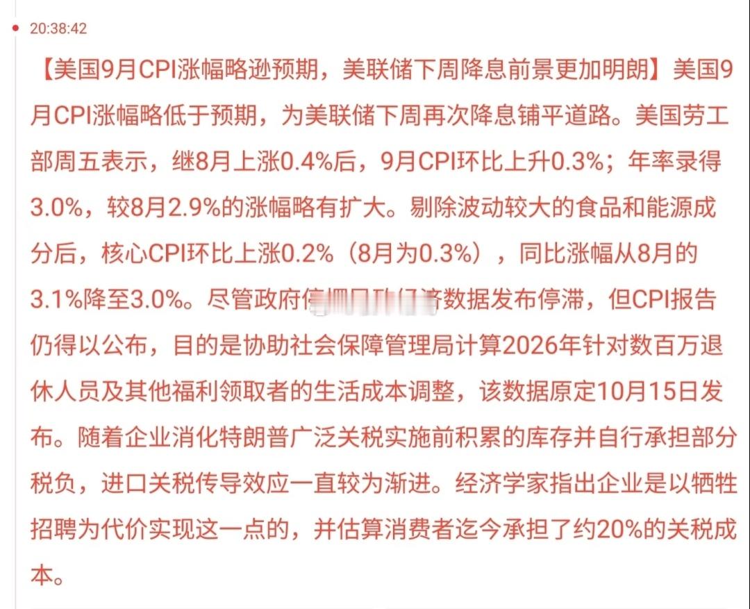 九月CPI低于预期,美联储下周降息前景更加明朗。。
