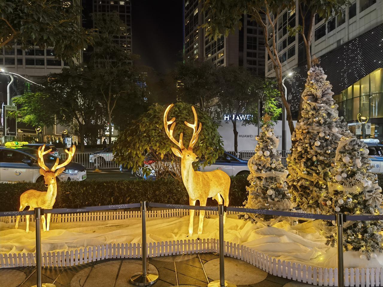 城市夜景中的圣诞鹿与雪景树,浪漫氛围满满!