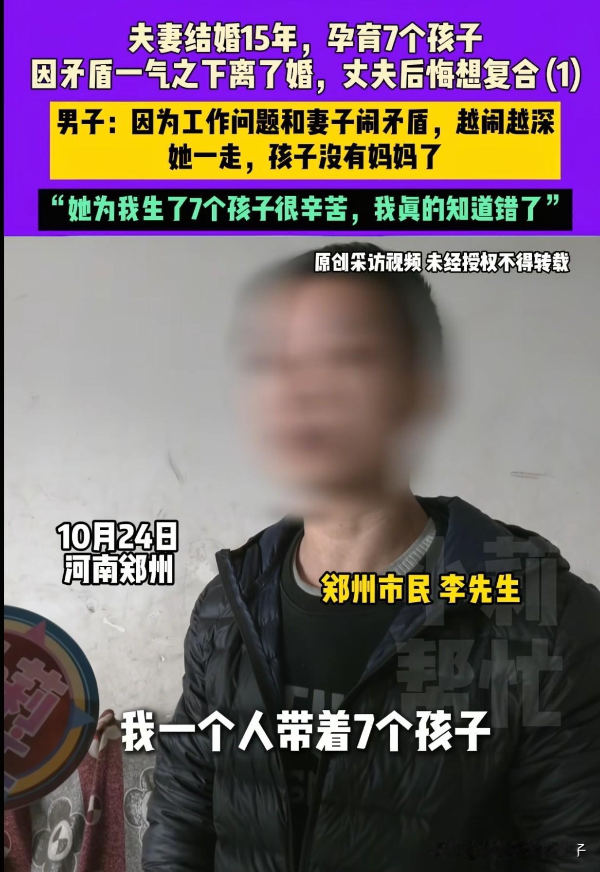 他不是后悔离婚了,而是后悔7个孩子没有人照顾了! 男子和朋友合伙开了一家饭店,男子本想妻子辞职去饭店帮他,但妻子不愿辞职,不久后饭店倒闭了,男子却责怪妻子不支持他的事业,俩人因此经常吵架。 于是男子便主动提出离婚,俩人办完手续后,男子就把妻子从家里赶出去了! 可没过多久,男子后悔了,他想让妻子回来,可女的根本不搭理她,当初离婚后男子为了发泄情绪,还找到女子公司的宿舍去污蔑造谣,把女子的心伤透了。 现在家里每天都乱成一团,还有2个老人需要照顾,男子已经没办法了,只能求助媒体,全网喊话给女子道歉,他真的知道错了,以后再也不会喝酒,也不会拿她出气了! 后续,在小莉帮忙的联系下,女子最终答应了下周找个时间和男子见面谈谈! 这对夫妻是真厉害,结婚15年,生了7个孩子,这男的更是极品,还敢把老婆赶走,只能说他勇气可嘉,大家觉得呢!