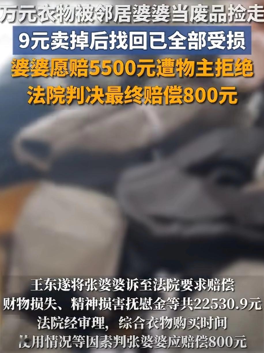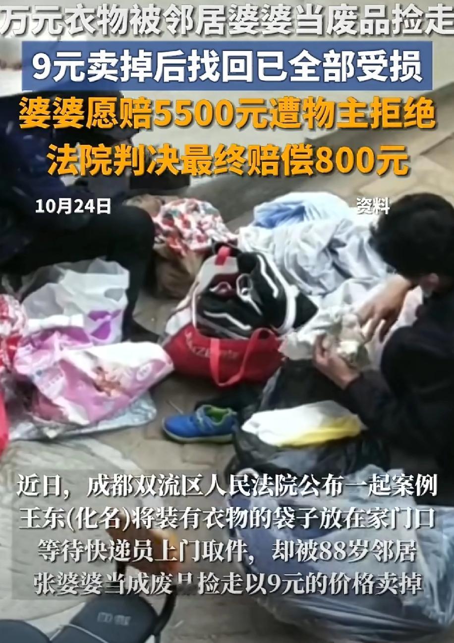 一万多的衣服,被88岁邻居张婆婆9块钱当废品卖了,小伙子王东直接起诉索赔两万二,连精神损失、误工取证都算进去,结果法院只判了800。这事儿一上热搜,网友炸锅:有人喊“欺负老人”,也有人笑“放门口当垃圾,怪谁”。 说白了,就是王东把一袋要寄出的高档衣服搁在家门口,转头进屋拿手机,张婆婆眼神不好,顺手捡了卖废品,9块成交。等王东追过去,衣服已经折腾得又皱又脏,标签都掉了,心疼得他立马报警、做鉴定、请律师,账单一路飙到两万多。老太太家觉得离谱:一堆“旧衣服”凭啥这么贵?双方谈不拢,只能对簿公堂。 法官最后折中:衣服确实贵,但你随便放门口也有过错;老人视力差、无主观恶意,赔800算合理,儿媳当场转账。一个疏忽,一万变八百,还搭上诉讼费,王东这波“血亏”买了教训:贵重物品别放门口,监控和保价才是亲兄弟;张婆婆也长记性,废品袋以后只敢拿自己家的。一句话,值钱的东西自己不上心,法律也只能“象征性”帮你止损。 (来源:九派新闻)