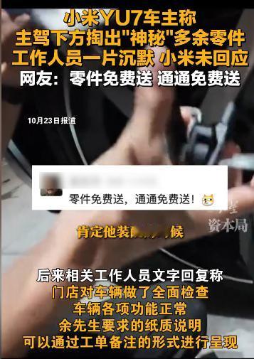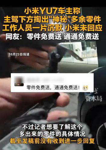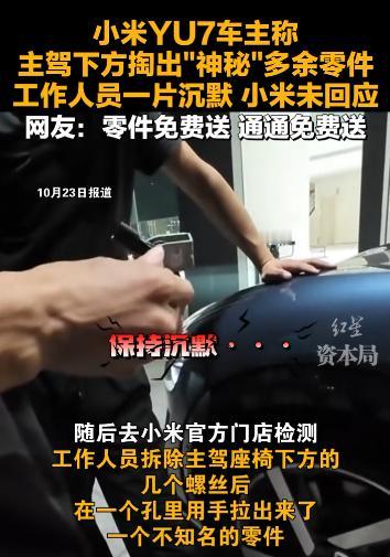 “小米车内掏出不明零部件”最新后续!市场监管部门已经介入调查! 浙江金华的余先生至今记得10月14日傍晚摸向新车脚垫时的触感。 指尖刚碰到主驾座椅下方,就被一块硬邦邦的凸起顶了回来,按下去纹丝不动。 30多万刚提两天的小米YU7Pro,怎么会有这种东西? 他蹲在车旁反复确认,心里的欢喜瞬间凉了半截。 那天他正换第三方全包围脚垫,这块藏在地板缝隙里的凸起格外扎眼。 他赶紧掏出手机拍照,用红圈把驾驶员腿边的异常位置标出来,镜头里能清晰看到地板微微隆起的弧度。 次日一早就联系小米客服,对方让他去金华的服务门店检查,可他没想到,这场检查会让他更犯嘀咕。 10月15日的门店里,螺丝拆卸的清脆声格外刺耳。 工作人员拆下主驾座椅抬起来,手伸进底部的孔位,掏出个L型金属件。 表面是黑色阳极氧化处理,带着活动关节和销钉,还有一串激光刻的编号“XMP20230875”和13位二维码。 余先生赶紧追问这是什么,在场的技师和店员却互相对视,没人能说出答案。 他掏出手机扫码,屏幕上只跳出一串数字,连个零件名字都没有。 我不要赔偿,就想知道三件事:这零件叫什么、从哪来、会不会影响安全。 余先生的要求很直接。他做长途通勤,每天要开高速,一想到高速上这零件可能卡住座椅滑轨,或者急刹车时飞出来,就浑身发紧。 可门店只给了张“车辆功能正常”的检测单,对零件的事只字未提,售后负责人后来才口头说了句“工厂疏忽”。 更让余先生窝火的是,他一直没等到小米的正式回复。 直到记者联系他时,他手里只有一张写着“客户反馈座椅下异物”的工单备注,连份像样的书面说明都没有。 而小米售后面对问询时却说,已经给车主发过短信,是对方没回复。 余先生翻着通话记录和短信箱,语气里满是无奈。 这事很快在网上传开,不少网友跟着揪心。 有汽车行业的网友分析,这零件看着像座椅调节的限位装置或线束支架,本该有明确的安装位置,出现在地板下极不正常。 好在10月23日有了新进展,义乌市场监管局正式介入调查。 执法人员明确表示,会重点查三件事:这零件的真实来源、小米的装配流程是否合规、质量管理体系有没有达标。 消息传来时,余先生松了口气,“终于有人来问个明白的了”。 而这场风波里,车主想要的从来不是补偿,而是一份能攥在手里的安全证明,一句明明白白的解释。 其实消费者的要求真不高,30万买的是安心,不是“拆盲盒”式的惊喜。 小米常说“技术为本”,可再先进的智能座舱,也抵不过一颗不明零件带来的信任危机。 市场监管的调查还在进行中,所有人都在等一个答案。 这件事给所有车企都敲了警钟:新能源车不是快消品,一颗螺丝的去向、一个零件的身份,都藏着用户的信任。 短信代替不了书面说明,“工厂疏忽”的借口捂不住品控漏洞。 用户的信任需靠“透明沟通+扎实品控”赢得,忽视细节终将失去市场。 信息来源:第一现场2025-10-23发布视频