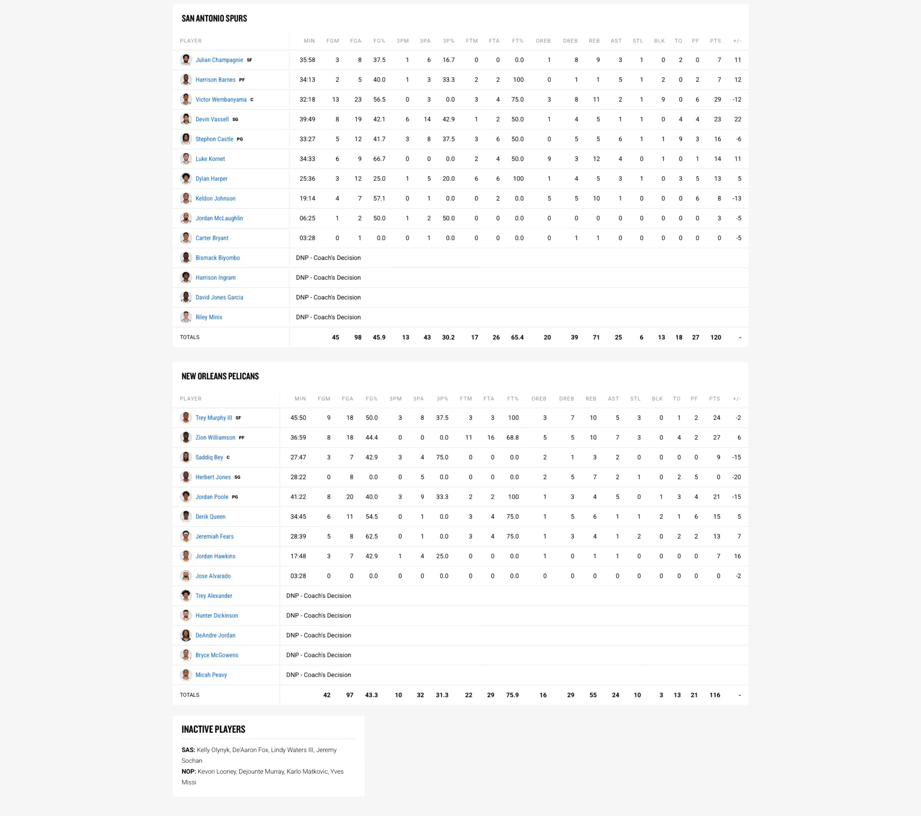 鹈鹕(0-2):锡安27分10板7助3断、墨菲24分10板5助3断、普尔21分4板5助、奎因15分6板1助2帽、费尔斯13分4板1助2断、贝9分3板2助、霍金斯7分1板1助、赫伯特-琼斯7板2助