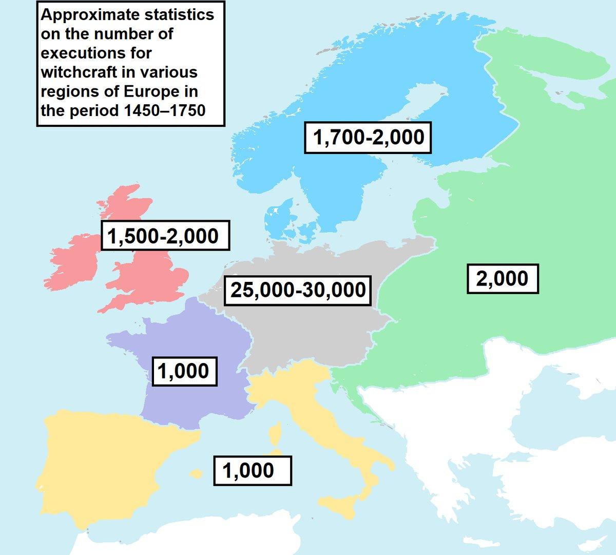 欧洲猎巫300年地图:各国直接弄死3万人!这张地图以统计图形式,直观地呈现了1450年至1750年间欧洲各地区因“猎巫运动”而被处决的人数。从地图整体可以看出,猎巫现象在欧洲范围内广泛存在,但程度差异显著。在欧洲中部(以现今德国、瑞士、奥地利地区为主的灰色区域),数字最为惊人——约25,000至30,000人被处决。这一地区当时是宗教改革与天主教反宗教改革的核心战场,地方法庭分散且审判权力广泛,导致“猎巫热潮”格外猛烈。小邦林立的德意志诸侯国尤其以频繁的“女巫审判”闻名,如符腾堡、黑森与巴伐利亚等地的法庭判决留下大量残酷记录。 在北欧地区(包括今挪威、瑞典、芬兰等蓝色区域),统计显示约有1,700至2,000人被处决。尽管规模较中欧小,但北欧的猎巫运动往往伴随极端宗教狂热与冰冷环境下的社会恐慌,例如17世纪晚期瑞典的“塔尔图女巫审判”。 西欧地区的情况相对温和。英国与苏格兰(红色区域)约有1,500至2,000人被处决,著名的案例包括苏格兰的“诺森伯兰审判”与英格兰的“彭德尔山女巫案”。法国与西班牙(分别为紫色与黄色区域)则各约1,000人,但西班牙由于宗教裁判所严格的法理程序,反而使大规模猎巫较少。意大利同样处于相近的水平(约1,000人)。 在东欧(绿色区域),约有2,000人被处决,代表地区可能包括波兰、立陶宛与波希米亚等地。这些地区的猎巫活动往往受西欧宗教思潮影响而延迟爆发,但在17世纪中期仍出现剧烈高峰。