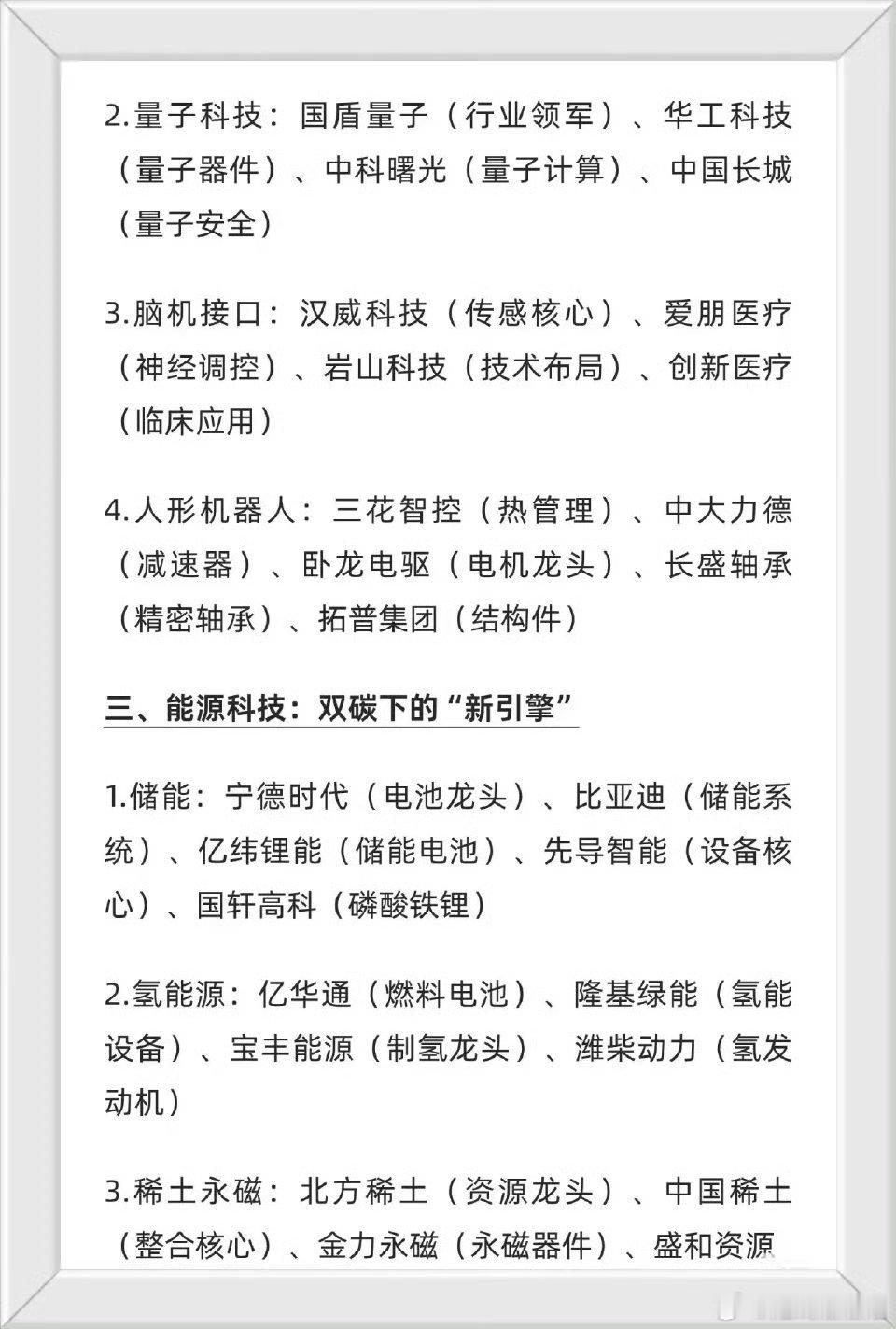 - 量子科技:国盾量子(行业领军)、华工科技(量子器件)、中科曙光(量子计算)、中国长城(量子安全),涵盖量子器件、计算及安全等方向。