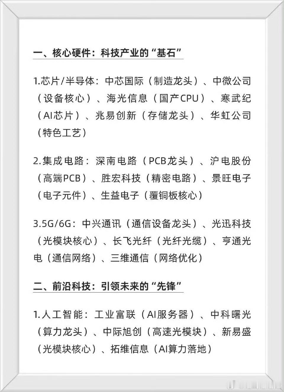 - 芯片/半导体:如中芯国际(制造龙头)、中微公司(设备核心)、海光信息(国产CPU)、寒武纪(AI芯片)、兆易创新(存储龙头)、华虹公司(特色工艺)等,覆盖芯片制造、设备、CPU、AI芯片、存储及特色工艺等关键环节。