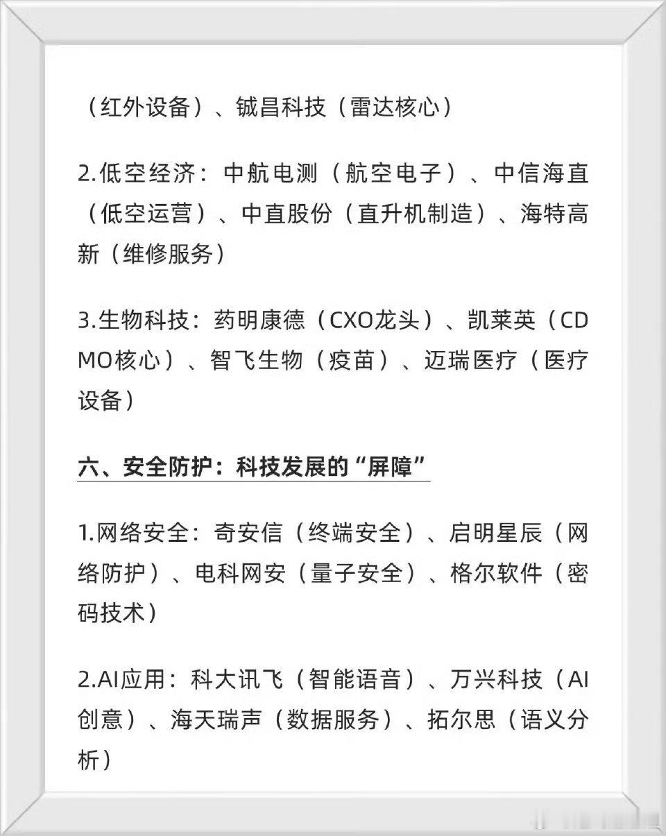 此外,在高端制造板块中,重点提及了军工与高端装备,包括中航沈飞(军机龙头)、航发动力(发动机)、中航光电(连接器)、高德红外等,体现产业升级的核心力量;还有低空经济(如中航电测、中信海直等)、生物科技(如药明康德、凯莱英等)相关内容。