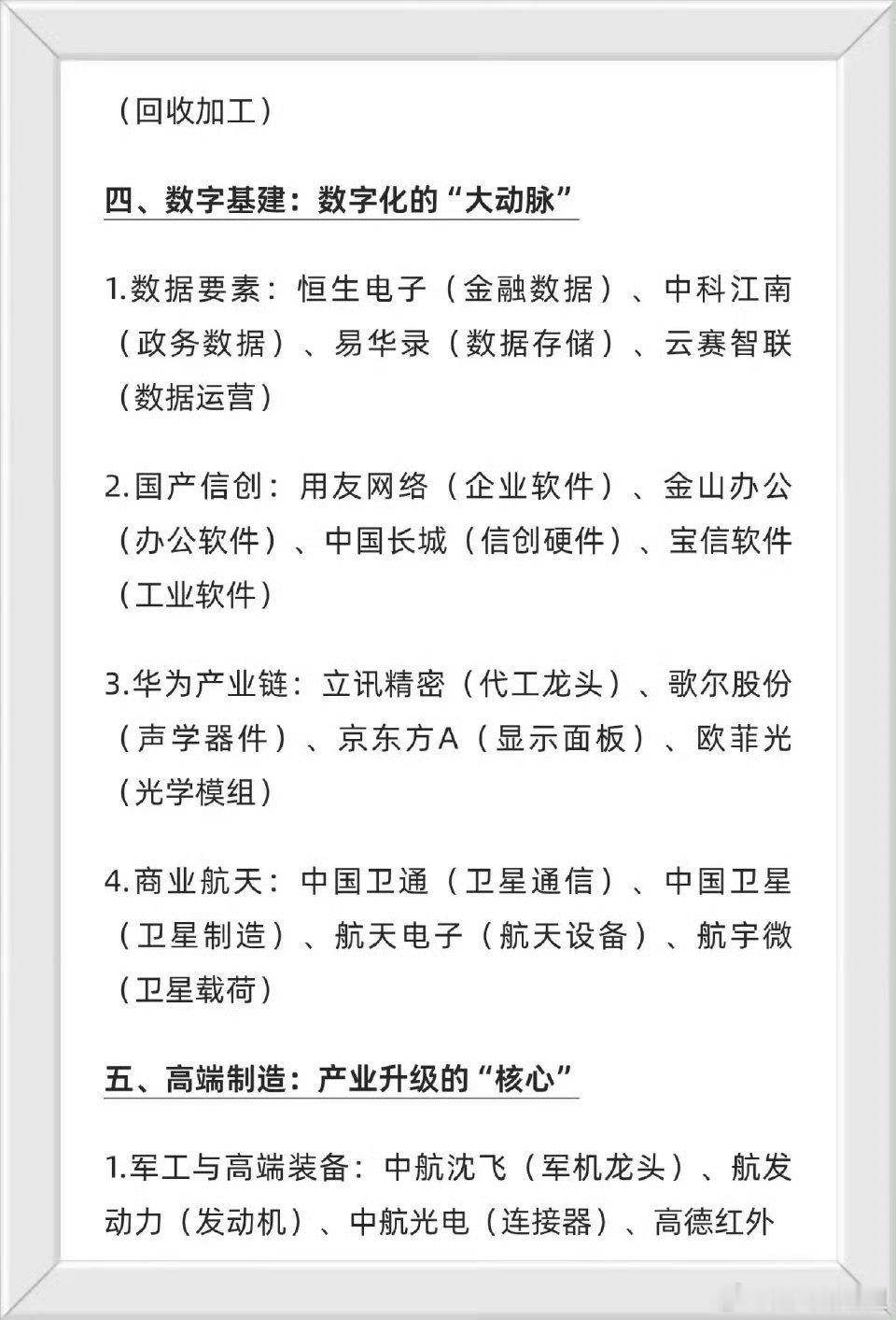 - 人工智能:工业富联(AI服务器)、中科曙光(算力龙头)、中际旭创(高速光模块)、新易盛(光模块核心)、拓维信息(AI算力落地),体现AI在服务器、算力、光模块及落地应用等方面的发展。