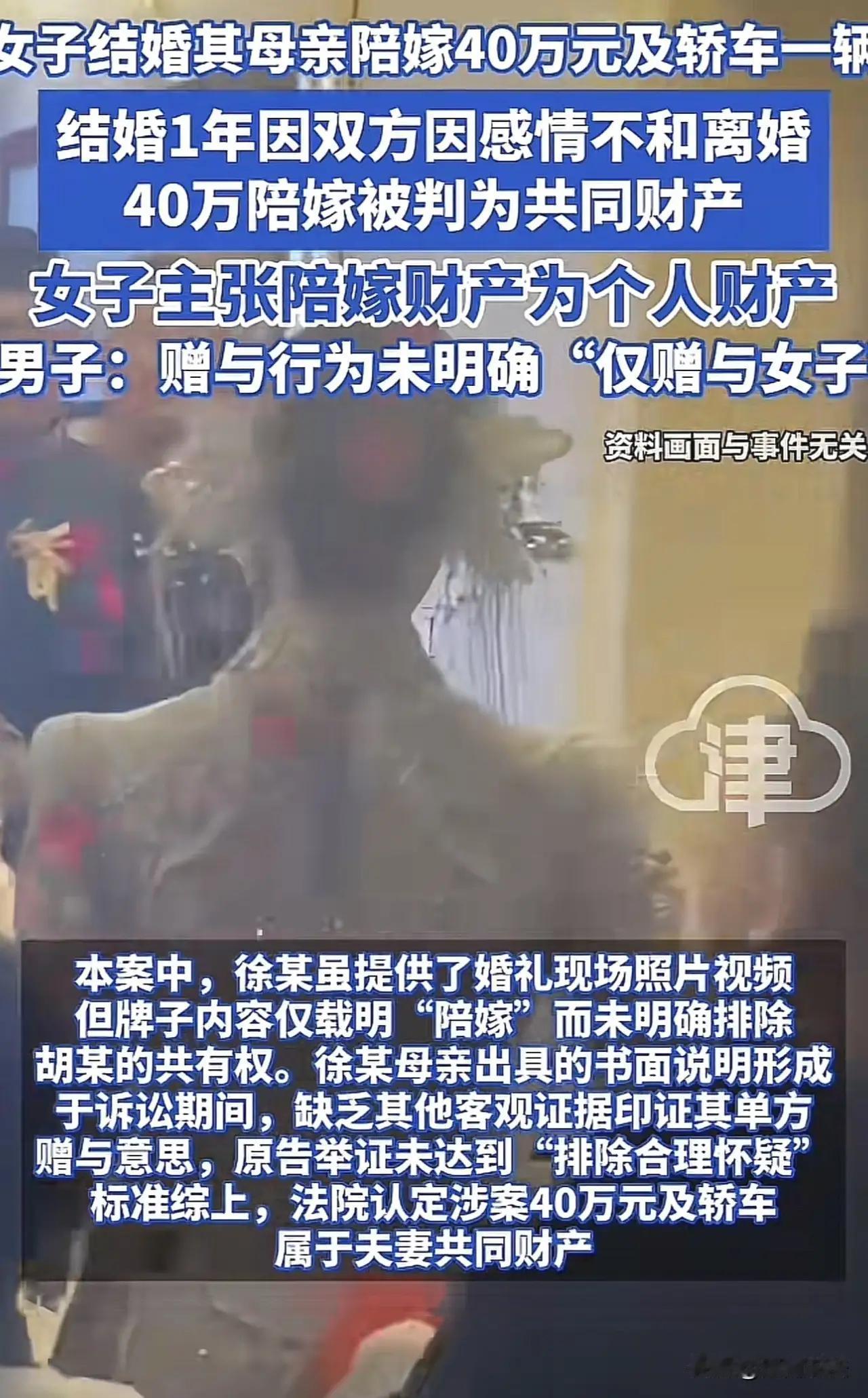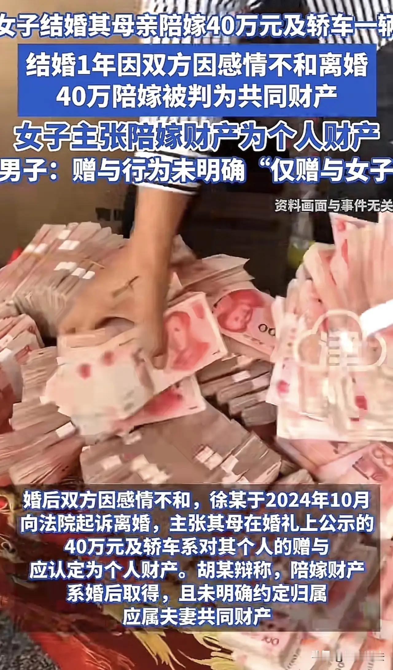 山东icon,一女子嫁人,娘家直接陪嫁一辆汽车和40万,岂料不到1年,夫妻俩吵着离婚,妻子认为这40万和小车,是娘家赠与她个人的,要带回娘家,可丈夫不同意,认为这是夫妻共同财产应当平分,而法院判决令人意外! 在这个充满变数的婚姻世界里,财产的归属问题总能成为一场激烈的角力。有人说,婚姻是两个人的事,但当财产成为焦点时,却仿佛变成了一场没有硝烟的战场。这次发生在山东的案件,正是最好的写照:一位女子嫁人,娘家直接送上一辆汽车和40万元现金,原本以为是家庭的幸福象征,却在短短一年后,变成了财产争夺的导火索。 这位女子的娘家,出手阔绰,把一辆崭新的汽车和40万现金作为陪嫁,似乎在告诉所有人:这份爱与支持,是对女儿未来的最大保障。然而,谁曾想,这份“保障”竟成为离婚时的争议焦点。女子坚持认为,这些财产是娘家赠予她个人的,理应带回娘家,不应成为夫妻共同财产。而丈夫则坚决不同意,他认为,这些财产是婚姻期间的赠与,理应平分。 这场争执的背后,折射出的是现代婚姻中关于“财产归属”的深层次问题。传统观念认为,婚后财产应属于夫妻共同所有,离婚时应公平分割。而在现实中,随着家庭结构的变化、经济观念的转变,这个界限变得模糊不清。有人认为,娘家赠与的财产本应是个人财产,但也有人觉得,婚姻是两个家庭的结合,赠与的财产应视为共同财产。 法院的判决令人意外——最终裁定,这些财产属于女子个人所有,不属于夫妻共同财产。这一判决引发了轩然大波:有人点赞,认为这是对个人财产权的尊重,也是对娘家心意的认可;有人则觉得,这样的判决可能会让婚姻变得更加脆弱,甚至滋生更多的“财产战”。 这起案件让我们不得不反思:在现代社会,财产的界定究竟该如何界定?是尊重个人赠与的意愿,还是要考虑婚姻的共同利益?更重要的是,它提醒我们,婚姻不仅仅是感情的结合,更是责任与信任的契约。财产虽小,但关系到每个人的切身利益。 你怎么看?在你看来,婚姻中的财产归属应该怎么界定才最合理?是坚持传统的“共同财产”观念,还是尊重个人赠与的“私有”权利?留言告诉我,让我们一起探讨这个关系到每个人未来的敏感话题!女儿出嫁彩礼 陪嫁嫁妆