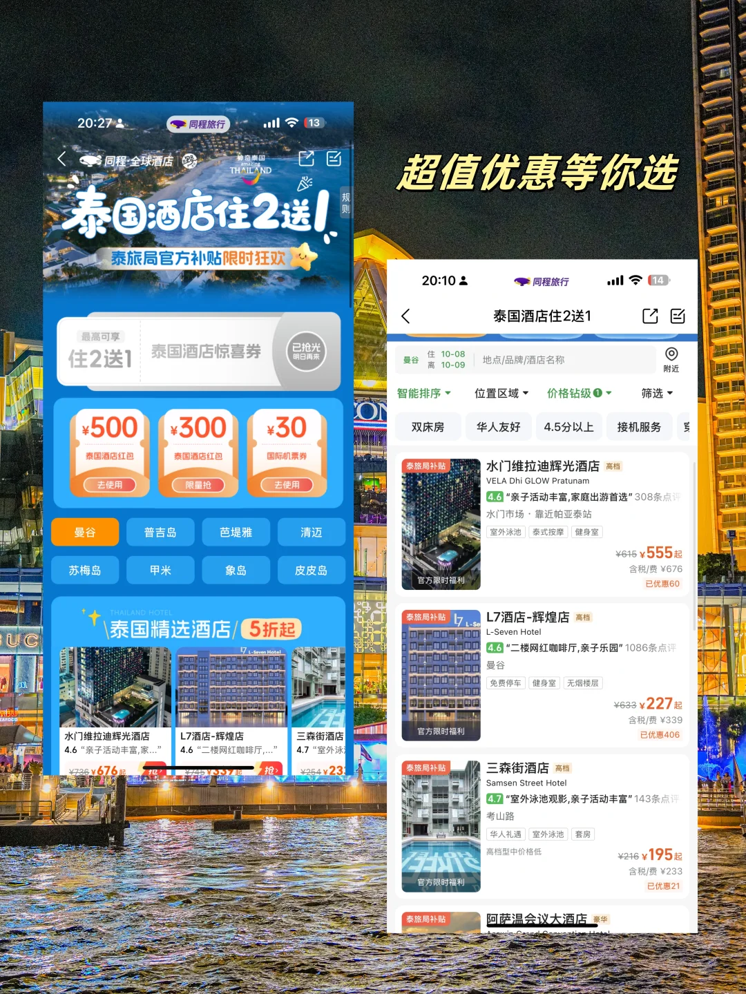 ✅性价比:现在我在同程小🍊或App搜索曼谷,就能看到“泰国酒店住二送一”活动,就可以领取到优惠, 人均只要200左右就能入住。而且还可以蹲点抢住二送一折扣券(连住三晚可用,至高抵扣1000元)以及85折直减券(连住两晚可用,至高抵扣500元)