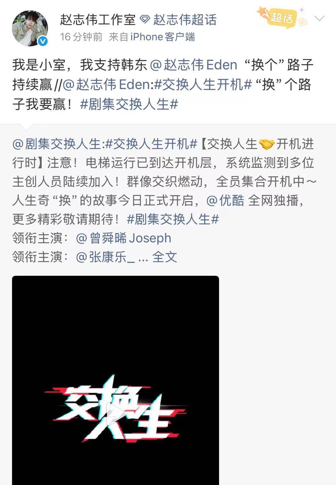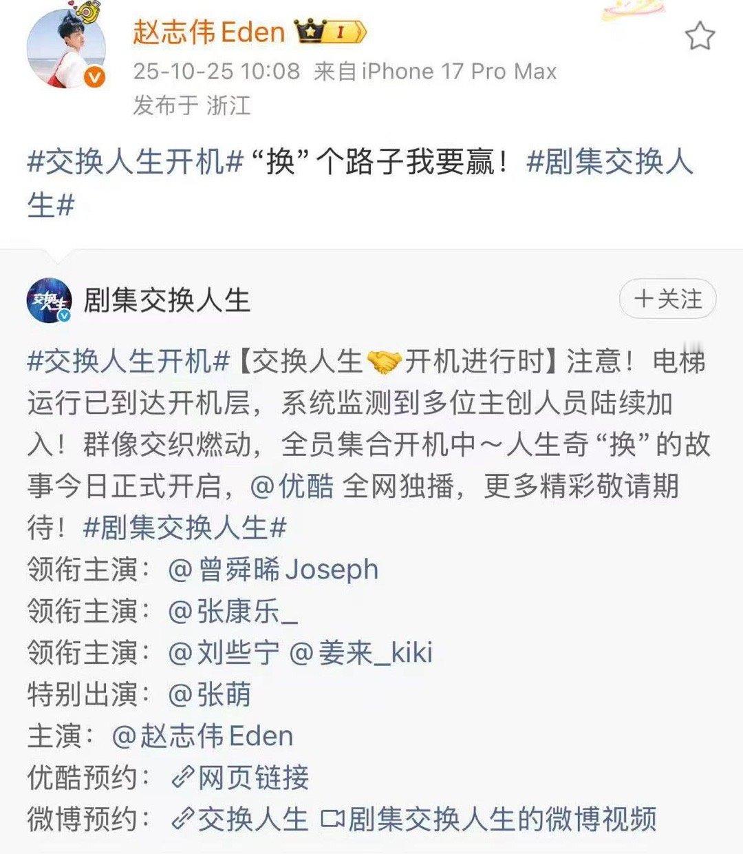 赵志伟换个路子我要赢赵志伟《交换人生》开机官宣主演,电梯门开启解锁人生奇“换”,直接打破“白天不懂夜的黑”!他事业势头正盛,官宣文案贴合主题超应景打call,坐等剧集开播!