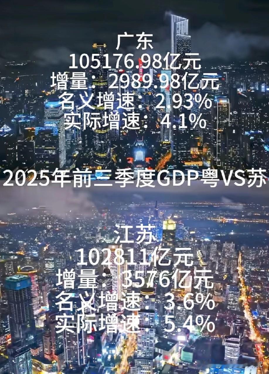 江苏与广东2025前三季度经济数据对比情况,江苏省与广东省2025年前三季度的经济数据都已经公布了,那江苏与广东前三季度谁的经济增长量更高呢?来看看江苏前三季度经济数据与广东前三季度经济数据对比就能够知道,江苏前三季度GDP为102811亿元人民币,GDP增长量为3576亿元人民币,而广东前三季度GDP为105176.98亿元人民币,GDP增长量为2989.98亿元人民币,从数据对比情况可以看出江苏前三季度GDP增长量3576亿元人民币,广东前三季度GDP增长量2989.98亿元人民币,可见江苏前三季度经济增长量要比广东前三季度经济增量更高一些。