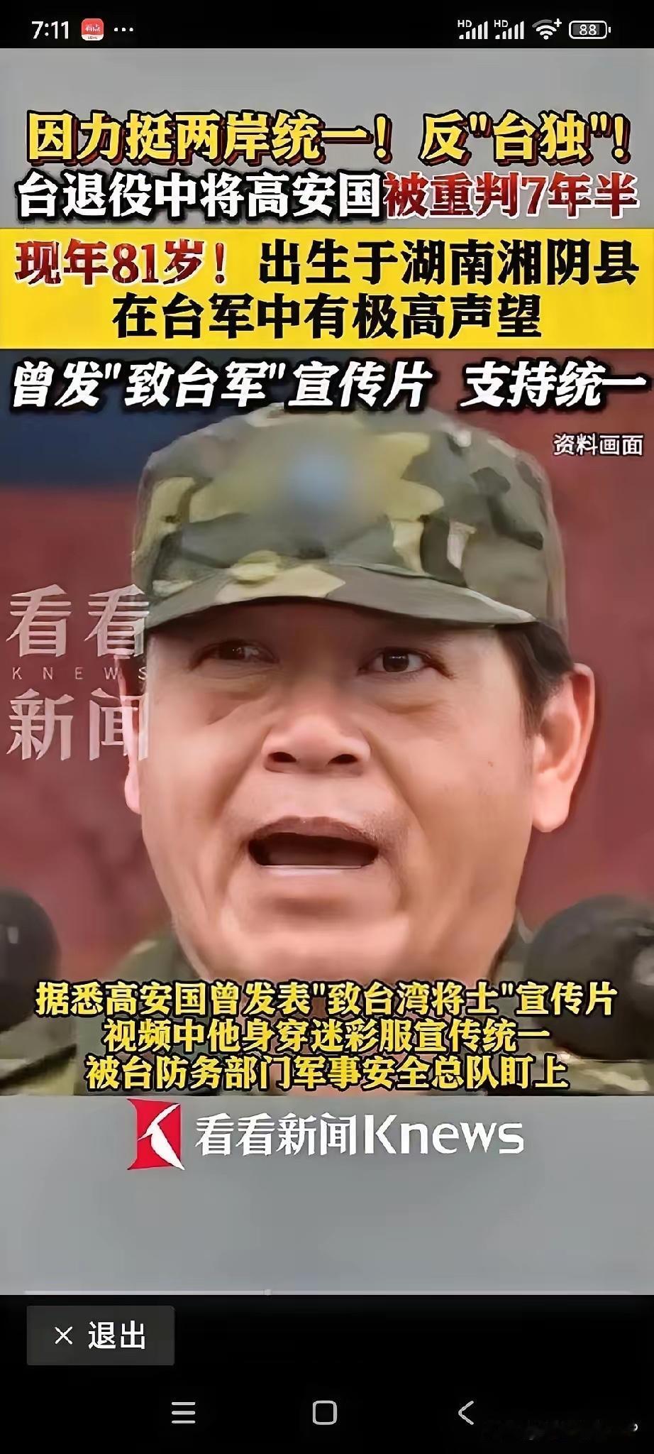 台独分子的末日快到了! 近日,来民进党当局,对台退役中将高安国等6人作出宣判!81岁的高安国因爱国促统、反对台独被判处7年6个月徒刑,并没收294700元个人财产! 俗话说的好:要想叫他亡,必先叫他狂。台民进党当局执迷不悟,倒行逆施,猖狂打压台湾爱国促统人士,极力在为谋求台湾独立做最后挣扎,充分暴露出他们内心的恐惧与焦虑!也预示着台独分子灭亡的日子不远了! 高安国将军1944年生于湖南湘阴,退役后一直力挺“九二共识”,就因拍了《致台湾将士》宣传片呼求统一,便遭此重刑。同案的5位伙伴也被判刑,刑期从2年6个月到6年10个月不等。 国台办第一时间发声,怒斥这是民进党滥用司法迫害爱国力量的恶行,正告作恶者必遭历史清算和法律严惩。这番话道出了两岸同胞的共同心声,字字铿锵有力。 前民代邱毅看得透彻,直言赖清德当局用“莫须有”罪名抓人,还严控消息、不让亲属探视,活脱脱是“东厂”和“法西斯”行径。这话一点不夸张,完全戳破了其虚伪面具。 民进党哪是在维护“安全”,分明是在搞“绿色恐怖”。2020年起就把法律当工具,封交流、禁异见,如今连81岁老人都不放过,就是要让支持统一的人不敢说话。 这种倒行逆施早激起了公愤。今年1月,近百名统派人士聚在台立法机构前,举着“反独促统无罪”的标语,高喊营救高安国,场面让人动容。新党、劳动党等多个团体都站了出来。 更荒唐的是,陆配“亚亚”只因说想和平统一,就被吊销居留证赶走,骨肉分离。艺人欧阳娜娜转发统一言论,也遭调查威胁。所谓的“民主自由”早成了笑话。 赖清德当局今年还搞了17项恶政,禁高校合作、监视艺人、打压陆配,把两岸交流的路堵得死死的。他们以为靠封锁就能留住权力,根本打错了算盘。 岛内民调早给出答案,超过62%的台湾民众反对“为台独打仗”。年轻人看透了谎言,纷纷来大陆发展,用脚投票选光明。谁还愿跟着“台独”瞎折腾。 民进党执政烂摊子一堆,经济下滑、外资跑路,2024年外资流入少了30%。抓统派、搞对立,不过是想转移注意力,掩盖自己的无能。 局势正在转向,前“立委”郑丽文刚当选国民党主席,直言要“全方位收拾民进党”。她要拆“台独”利益链,还计划访问大陆推动交流。 解放军的行动更坚定人心,航母编队常态化绕台巡航,联合演训一次比一次密集。《反分裂国家法》施行20周年,官方表态掷地有声:“台独”必遭依法打击。 国际社会也看得明白,美国对台战略耐心渐失,台积电等企业纷纷外迁,台湾的所谓“战略价值”正在贬值。没人真愿为“台独”火中取栗。 民进党能关住高安国将军的人,堵不住千千万万个渴望统一的声音。能禁掉一条宣传片,断不了两岸血脉相连的根。历史潮流从不会被逆行的小丑阻挡。 高安国案成了一面镜子,照出“台独”的疯狂与虚弱,也照出统一的大势不可逆转。两岸同胞的心连得越来越紧,这股力量谁也挡不住。台独妖孽 高安国 麻烦看官老爷们右上角点击一下“关注”,既方便您进行讨论和分享,又能给您带来不一样的参与感,感谢您的支持! 各位读者你们怎么看?欢迎在评论区讨论。