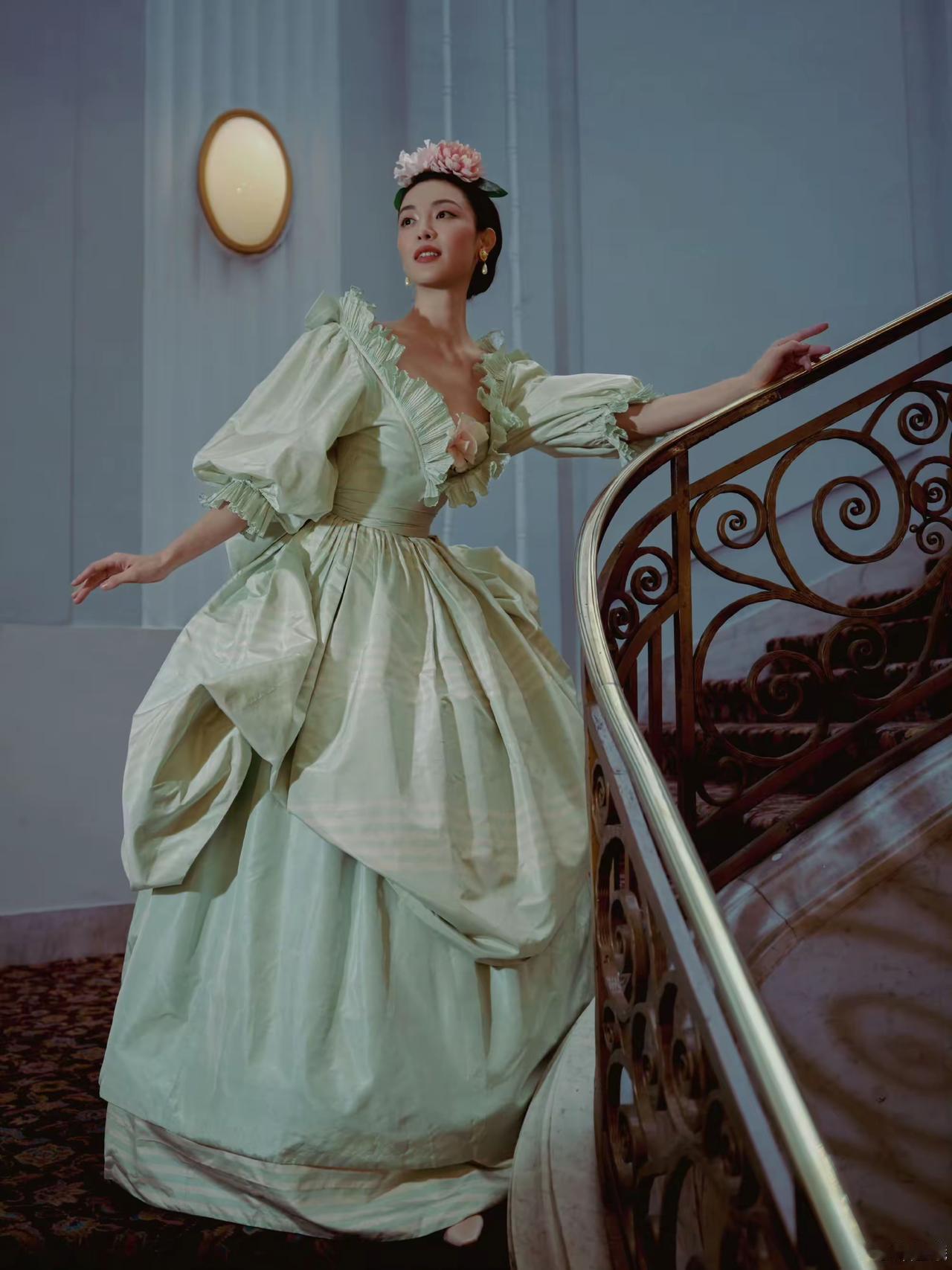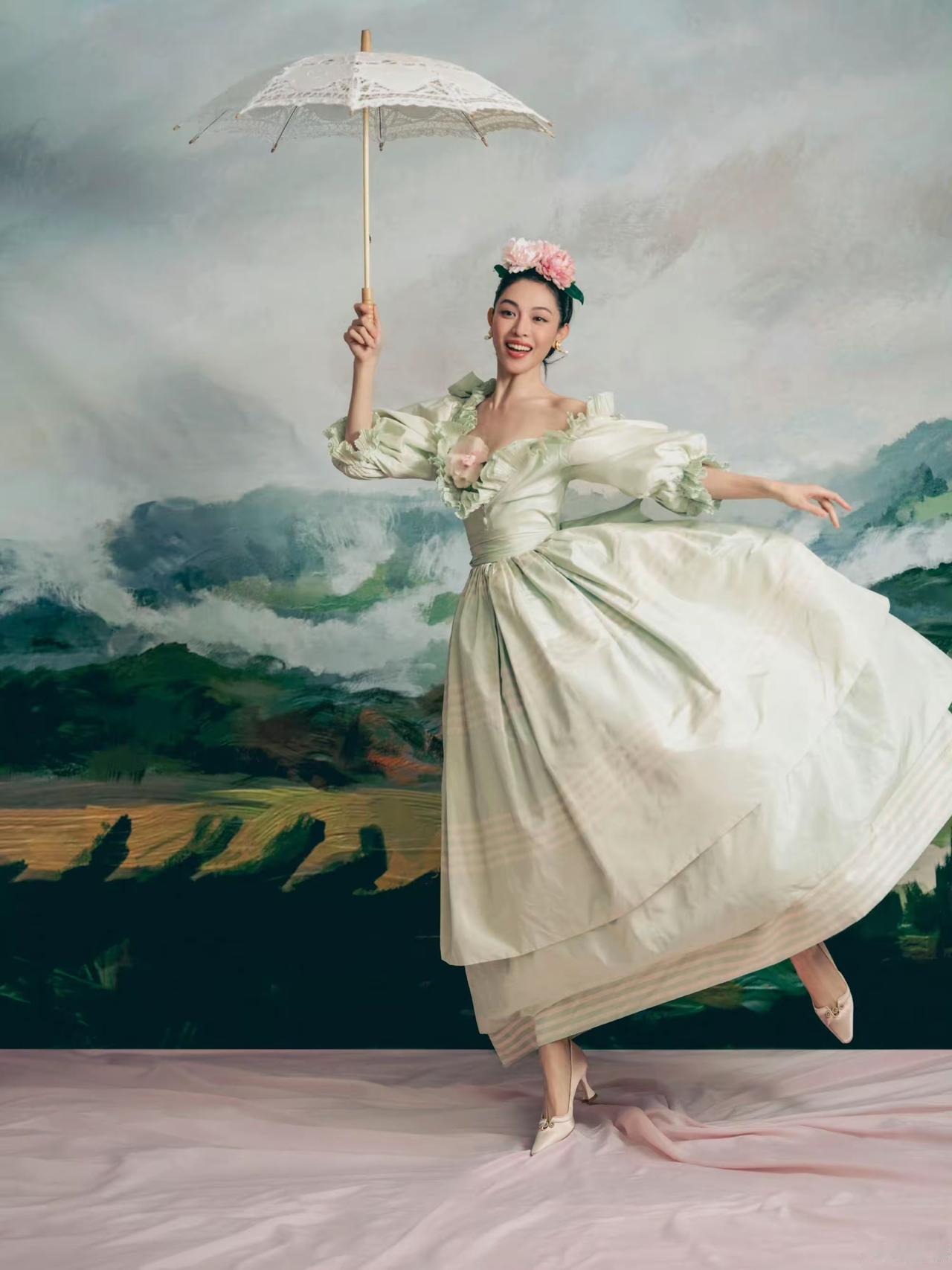 钟楚曦这一套衣服其实很出彩,很有傲慢与偏见中贵族小姐的范儿,但是放到集体照里就不够突出,因为颜色缺了亮点。 原有这个水粉绿色太轻快太青春了,压不住场子,假使这衣服是别的鲜艳的颜色,她会立刻制霸全场…… 现在她站里面,就像少女落进了老贵妇堆里,左边是大姨,右边是二姨……