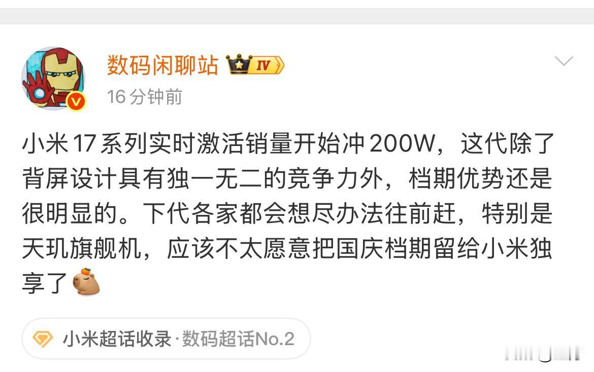数码闲聊站: 小米17系列实时激活销量开始冲200W! 就在刚才,数码闲聊站在社交网络上放出了这个数字,虽然他没有透露具体小米17系列的激活量数字是多少,但是他把2,000,000这个目标打出来之后,说明现在他们的激活量在无限的靠近这个数字。 也有人说,为什么友商这么长的时间,都没有大的动作,毕竟一半个月的时间了都把市场让给了小米,有人说可能是与台积电的产能有关系,所以一时半会儿跟不上。 当然,除了小米17系列之外,很多人都想知道刚刚发布的K90系列的最新数字,毕竟这个都已经发了两天了,这两天的数据对他们来说还是很重要的。
