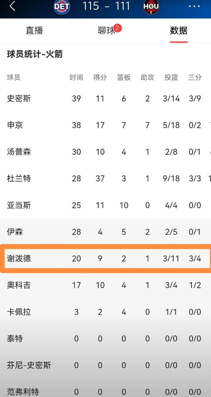 整场比赛下来,谢波德替补出战20分钟,投篮11中3,其中三分球4中3得到9分,还有3次失误,他的场上正负值为全队最低的-13。