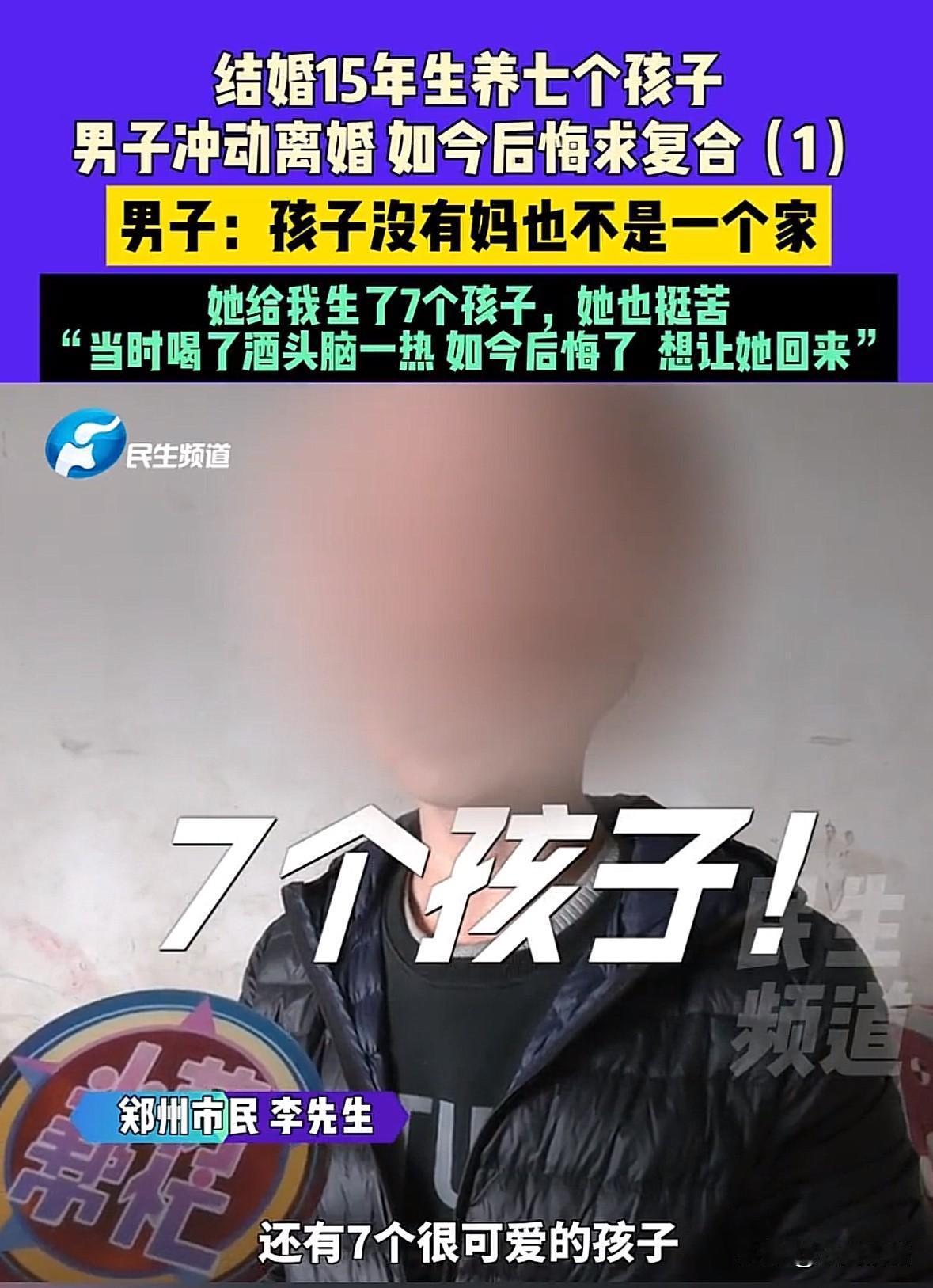 离婚4个月,7孩父亲后悔了! 河南郑州,有个开饭馆的李先生,大概是当上老板之后飘了,要求七个孩子的妈辞职到自家饭店帮忙,被妻子拒绝后恼羞成怒,对妻子恶语相加,更是在一次酒后忘了北,把妻子拉去民政局离婚并将她赶出了家门! 这下好了,七个嗷嗷待哺的孩子、一双年迈的父母,都需要这位硬气的李先生来伺候了。更加雪上加霜的是,饭店因经营不善也要倒闭了。 硬撑了4个月后,李先生撑不住了,想找前妻复婚,理由是“孩子需要妈妈”。奇了哈,离婚的时候咋没想过孩子需要妈呢?他难不成以为他的孩子是天生天养长大的? 7个娃啊!他前妻生了7个,还自己出去打工挣钱,这不更说明这个李先生的不靠谱了么?幸好前妻没有同意辞职去帮忙,不然她也得等着喝西北风。 前妻好不容易脱离苦海,不愿意复婚了! 这下李先生慌了,又开始找调解员了。咱都知道,有理找警察、无理找调解。 据前妻说,在离婚后,李先生还上门打人呢!现在发现家里缺了一个免费的保姆,又想后悔,晚啦!
