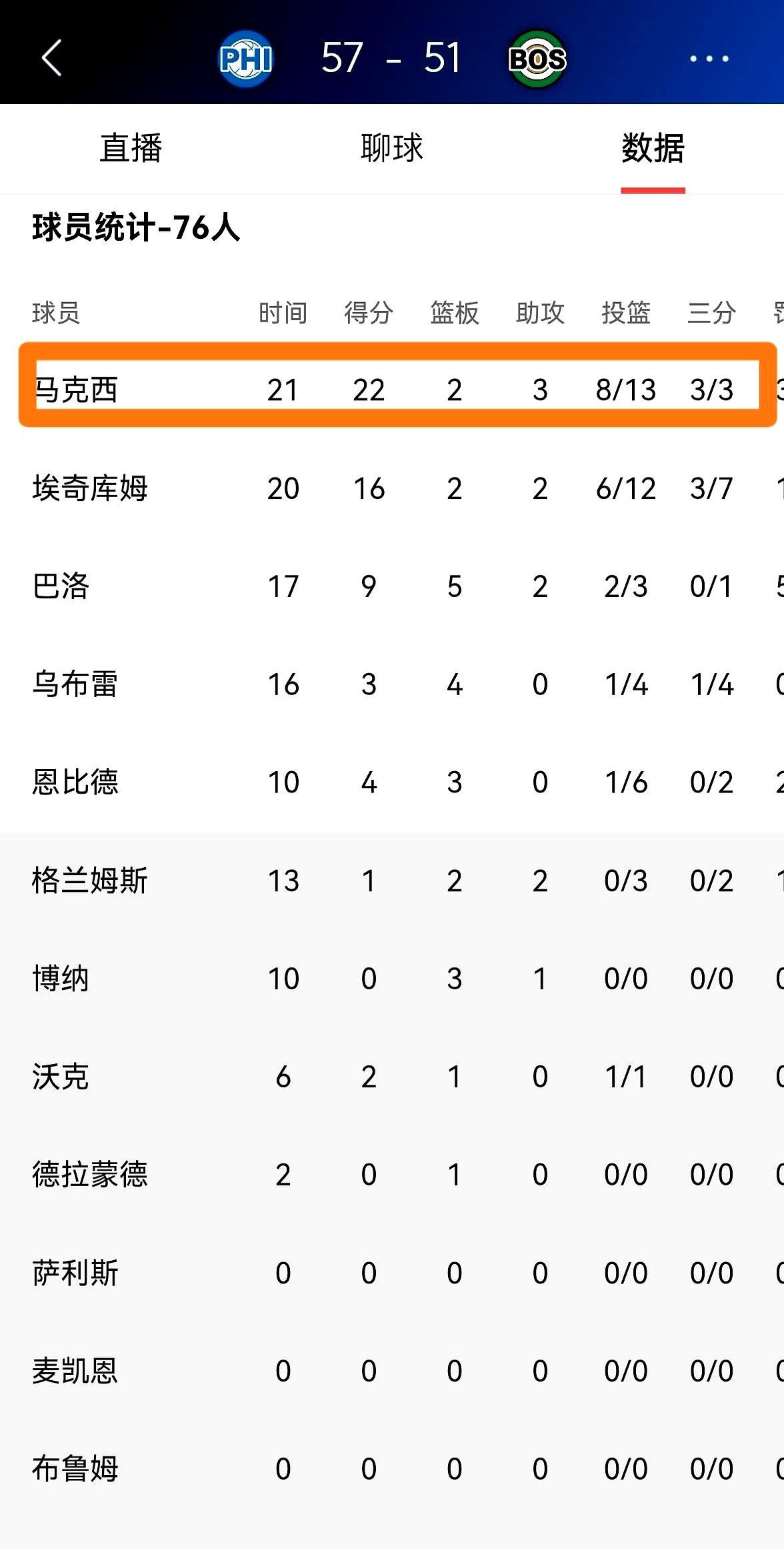 费城球迷今早差点没把咖啡泼出来,76人带着半成品阵容跑到波士顿打揭幕战,上半场直接57比51压住凯尔特人,而点燃整个TD花园的不是恩比德也不是仍在闹转会的哈登,而是三年级后卫泰瑞斯·马克西,21分钟砍22分,整个球馆像被插电,连绿军解说都忍不住多提了两句他的变速和抛投. 别看数据只写着13投8中三分3中3,这22分含金量不低,一上来他就对位霍乐迪吃了个急停拔三分,随后换到怀特身上连突带抛,外带一次抢断反跑一条龙,最骚的是零失误,这对一直被吐槽控球不稳定的他算是扬眉,推特上已经有费城记者直接改口叫他新款AI,虽然夸张,但至少今晚他确实像盛装版艾弗森. 问题来了,这场球到底是马克西突然爆表,还是绿军后场换血后防真有漏洞,马库斯·斯玛特走人,布罗格登打包,双后卫成了霍乐迪加怀特,纸面防守在线,但对于速度型杀手,协防默契还需要时间,再加上波神与塔图姆轮转中常被拉到高位,给了马克西很多一对一的赛道,如果道格·里弗斯还在场边可能会笑得嘴都合不拢. 哈登闹剧悬而未决,新帅尼克·纳斯需要一张稳定的王牌卡住后场,首战这么一爆,社媒上立刻出现两拨声音,一拨说趁热把哈登换走全力扶马克西,另一拨提醒别被一场球冲昏头,毕竟他季后赛稳定性还欠火候,纳斯怎么选,管理层怎么权衡,接下来客场背靠背与雄鹿的比赛或许能给出下一份样本. 总的看,马克西用上半场向费城和联盟递了张名片,夜还长,绿军能否修正针对性夹击,费城能否守住领先,更重要的是,当局势回到磨阵地的季后赛节奏,马克西能不能保持这种零失误高效率,如果能,下一个顶薪合同就不是妄想,如果不能,现在的惊喜可能很快被算法卷走,屏幕前的你押哪边.