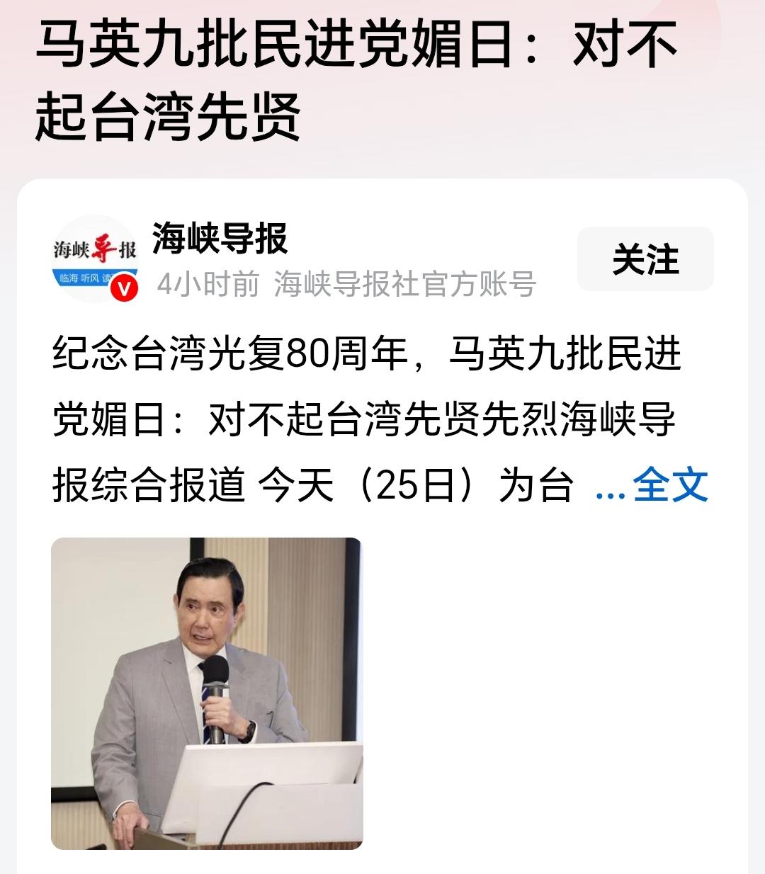马英九批民进党媚日对不起台湾先贤。为什么不批卢秀燕与民进党沆瀣一气对台湾光复节视而不见?为什么不检讨自己在任8年不拨乱反正修改台独课纲,看看现在的乱象丛生皆因历史错误认知而起。 台湾有今天的乱象民进党固然是罪魁祸首,但国民党也难辞其咎! 点右上角关注我,我们一起去看这个魔幻的世界