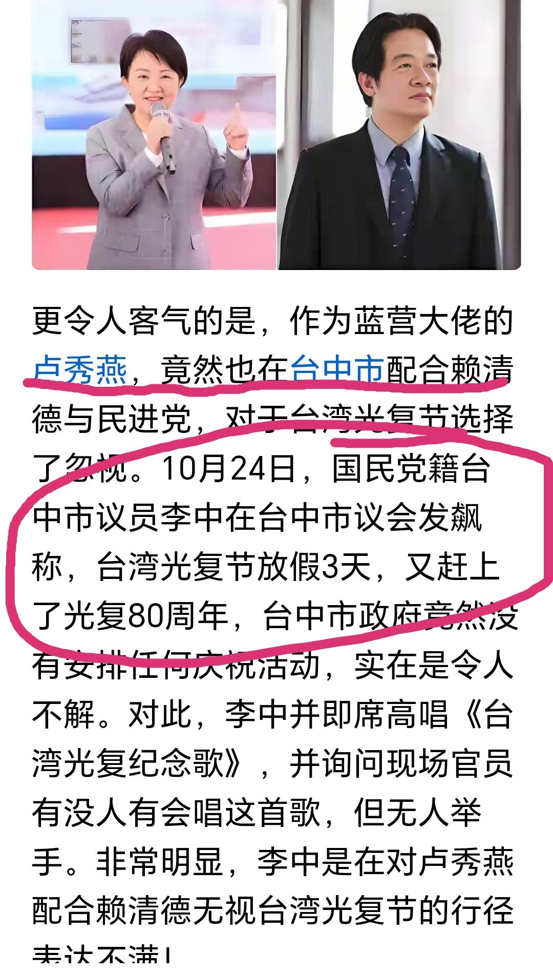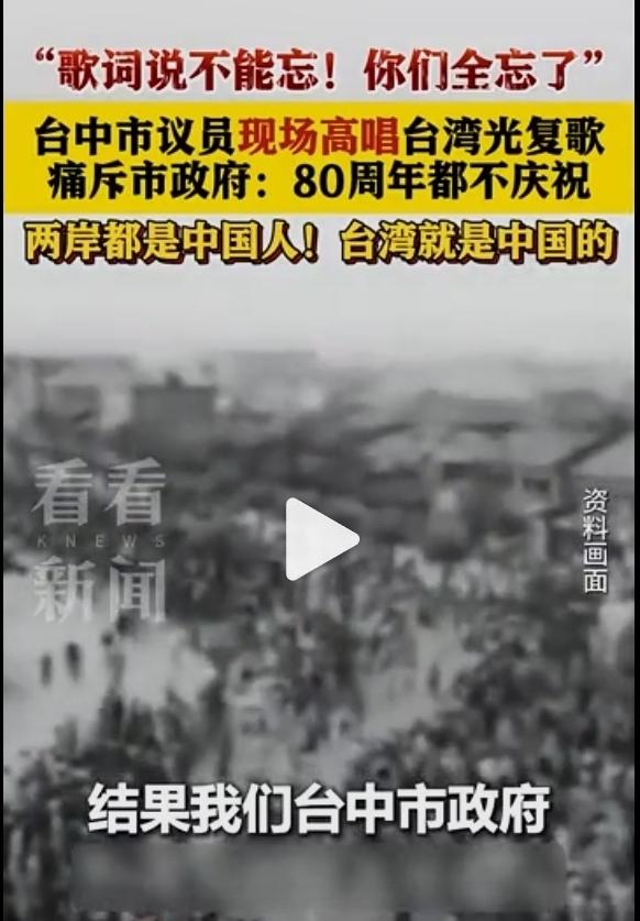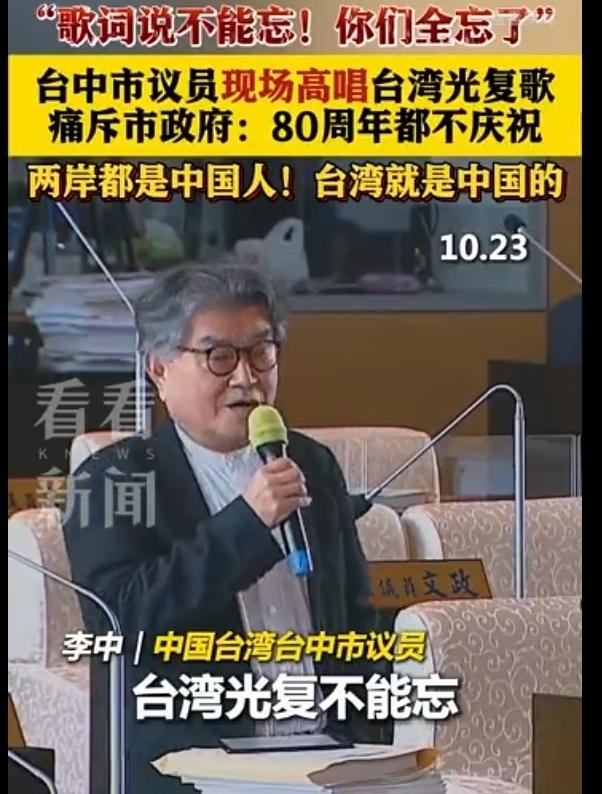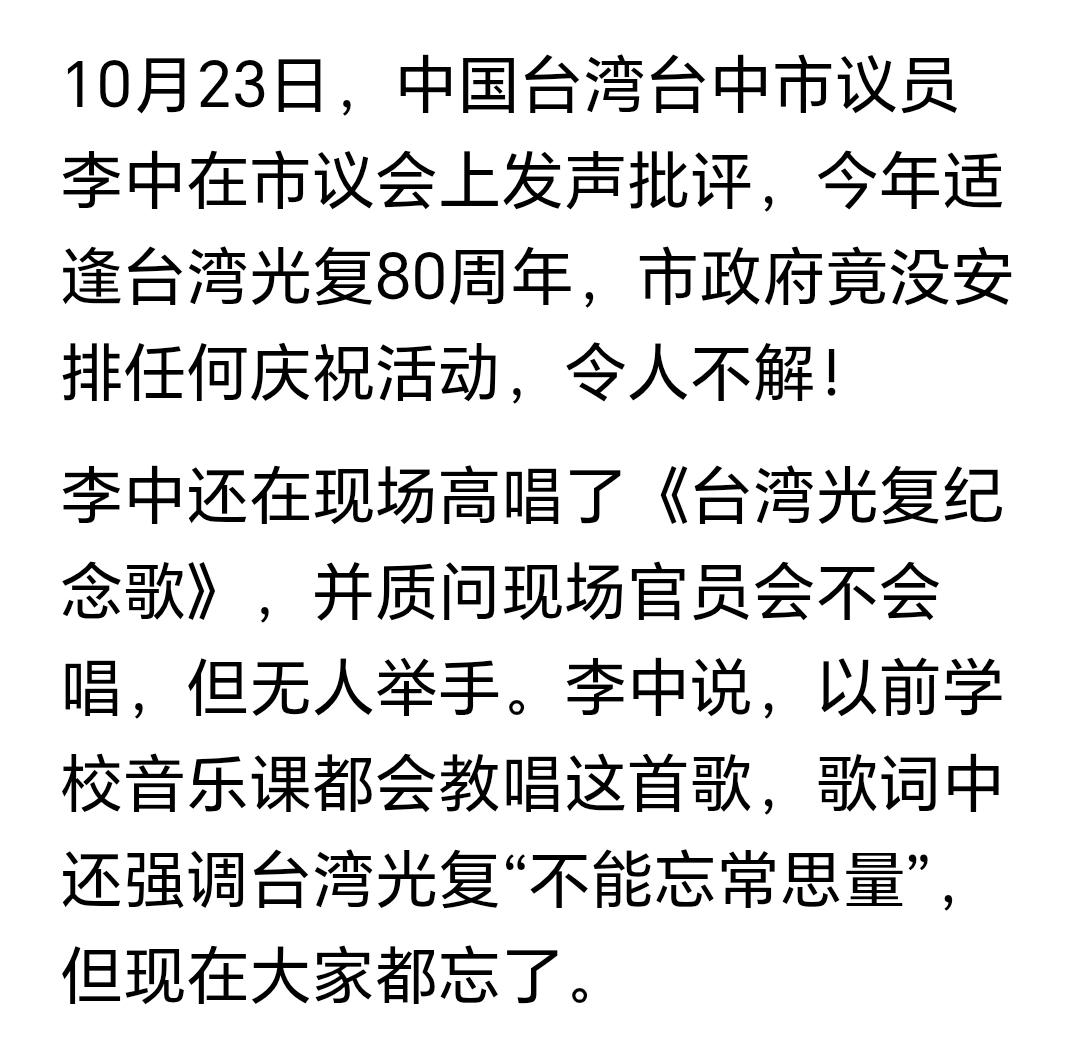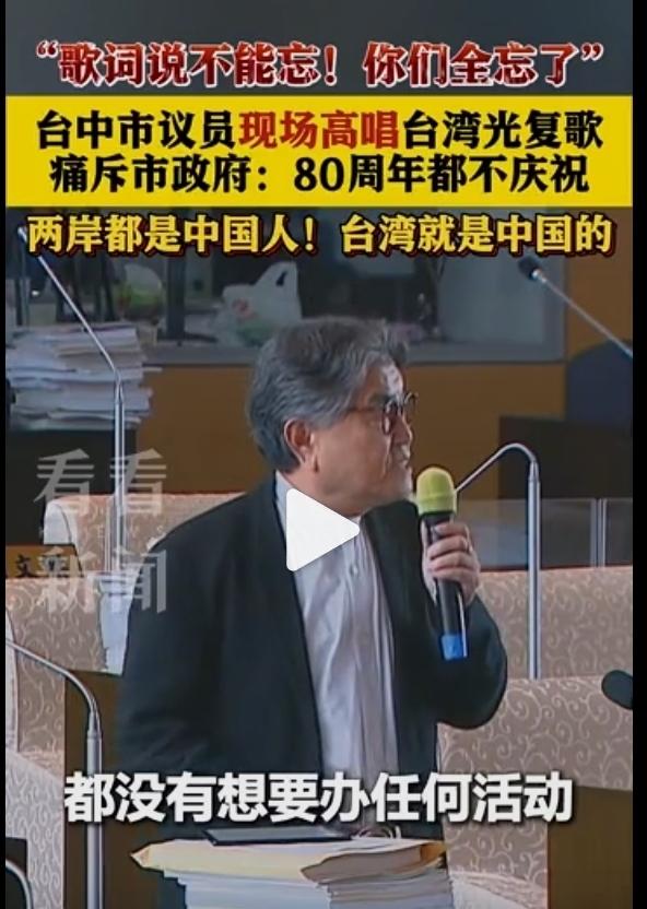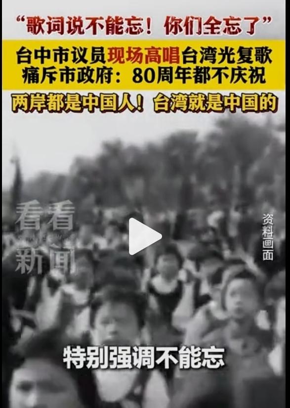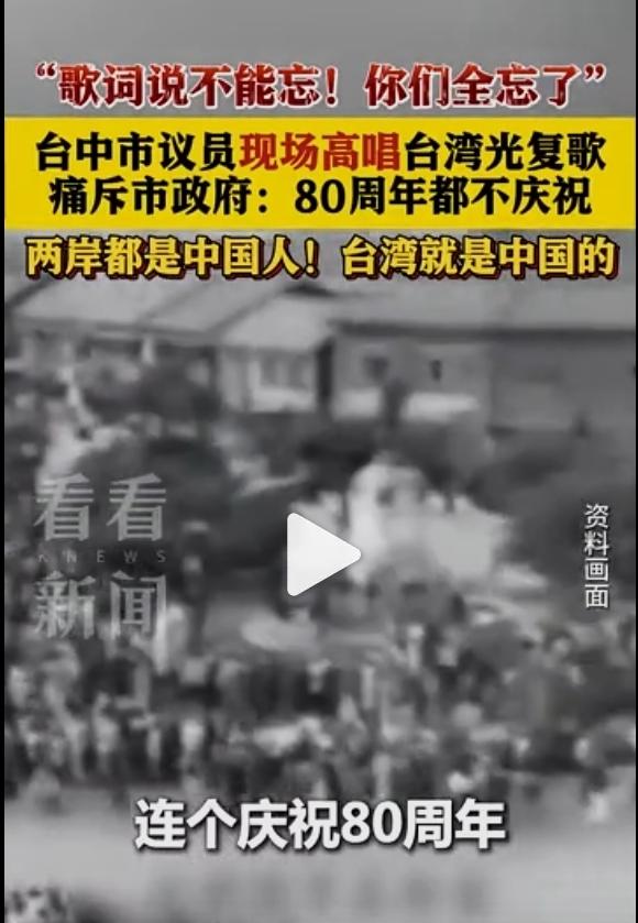 这位台中市的议员还是有点骨气。现场高唱《台湾光复纪念歌》,歌词里面有特别强调“不能忘”,但是80年后,他们还是忘了。台中市政府连个纪念活动都没有了。 卢秀燕和侯友宜一样的货色。没有家国,没有民族,只有个人算计。 点右上角关注我,我们一起去看这个魔幻的世界