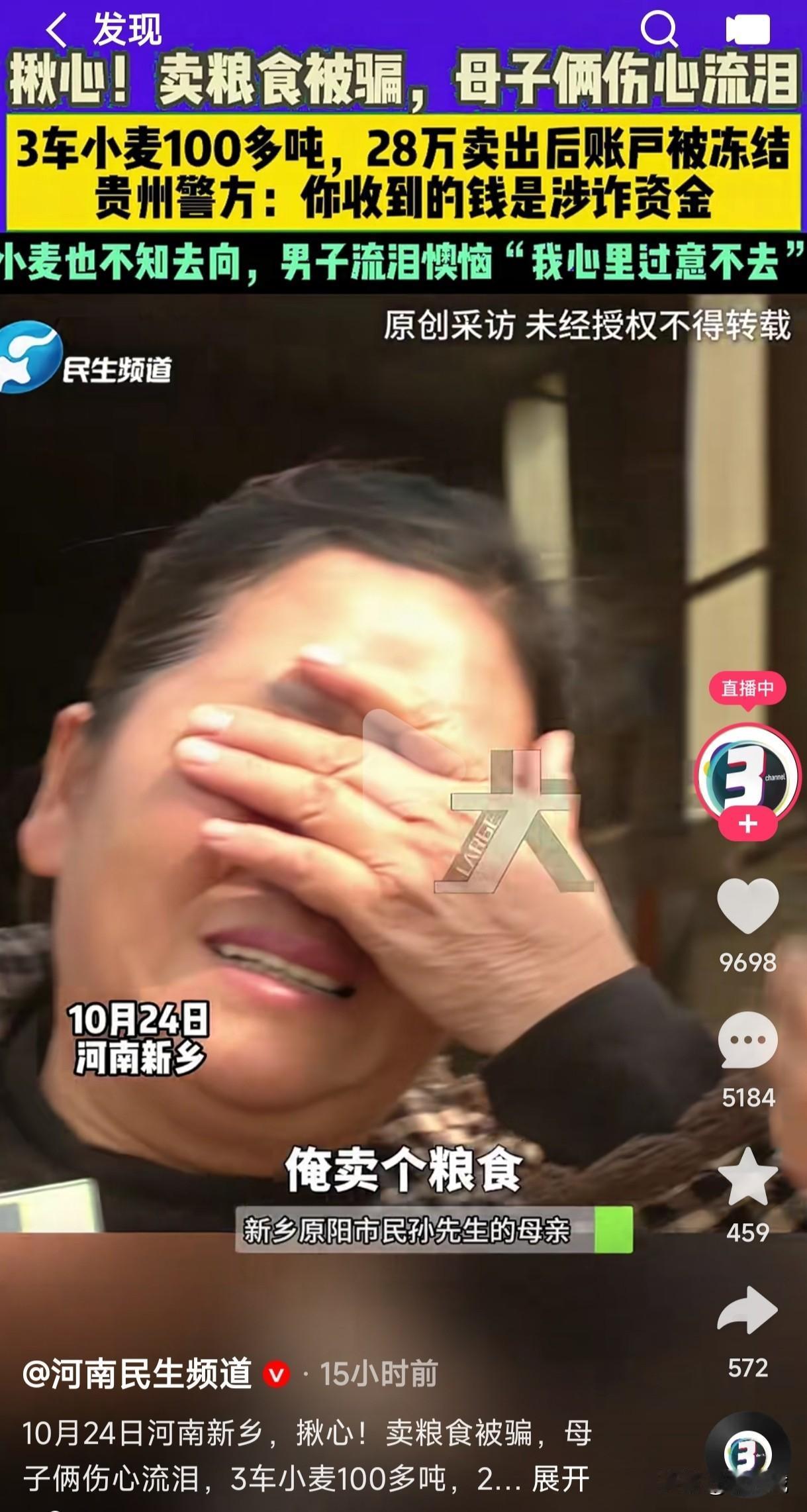 遭天杀的骗子真是该死。 河南新乡母子俩3车小麦100多吨,28万卖出后账户被冻结