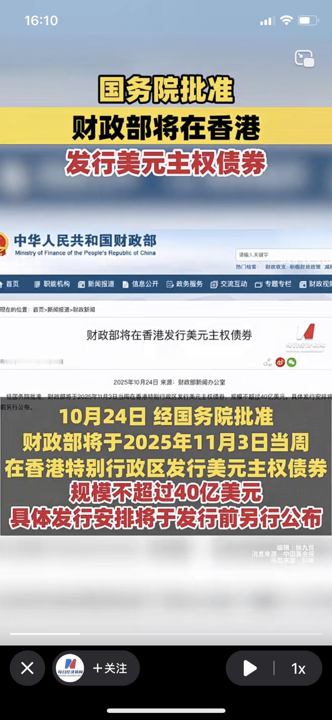 财政部将第8次在香港发行不超40亿的美元主权债券,显然不是差不差钱的事 早在2004年中国财政部就在香港发行了美元主权债券,发行的最高规模是60亿美元主权债券,最高认购规模达近20倍。 之所以要在香港发行美元主权债券,主要目的是主动融入并塑造国际金融体系、实际行动支持香港国际金融中心的地位、优化债务结构的同时对外传递出对本国经济前景充满信心、展示开放姿态,顺便帮所有中资企业在国际市场上发行美元债券打个样(定价参考)。 总之,财政部在香港发行美元主权债券,是一项具有多重战略意义的金融战略,而非一次单纯的融资活动。
