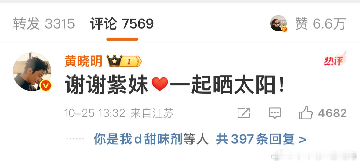 黄晓明回复:谢谢紫妹∞一起晒太阳