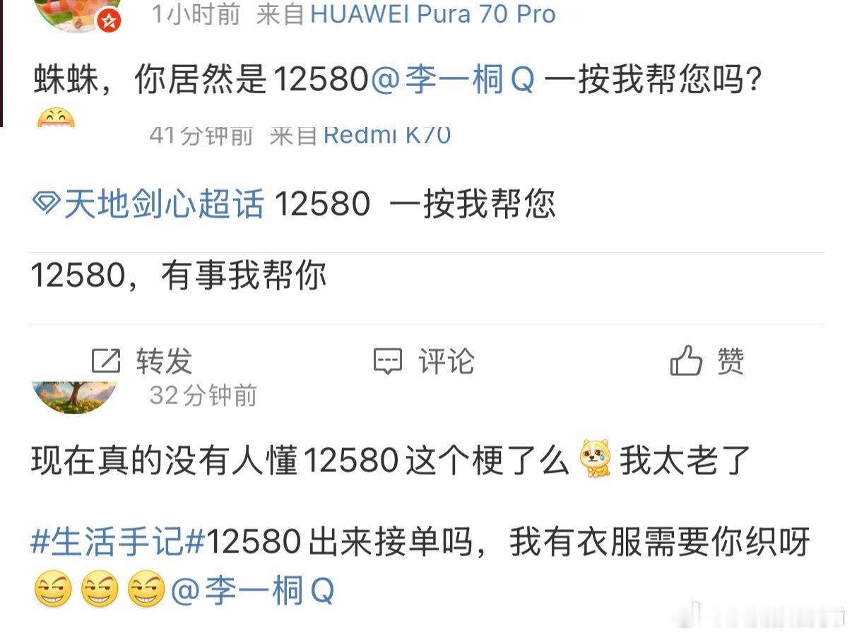 给李一桐发12580是什么梗 谁还没看过天地剑心 最萌的小蜘蛛精啊?!全网都在发12580给李一桐,看剧听到小蜘蛛叫自己”代号12580“的时候真的笑晕了好吗,古早的回忆又在攻击我[泪奔]”12580,一按我帮您“,帮忙织补衣服的服务型小蜘蛛真是太可爱咯!
