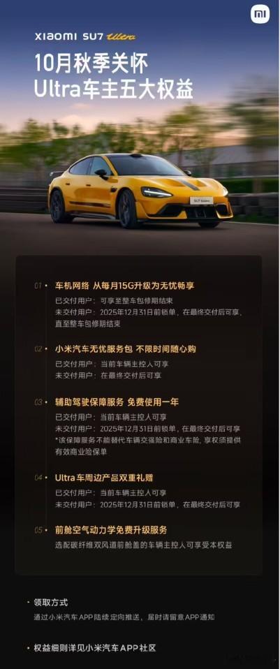 10月25日,小米汽车社区发布的“秋季关怀”公告,为SU7 Ultra车主提供了五大权益,其中包括前舱空气动力学免费升级服务。