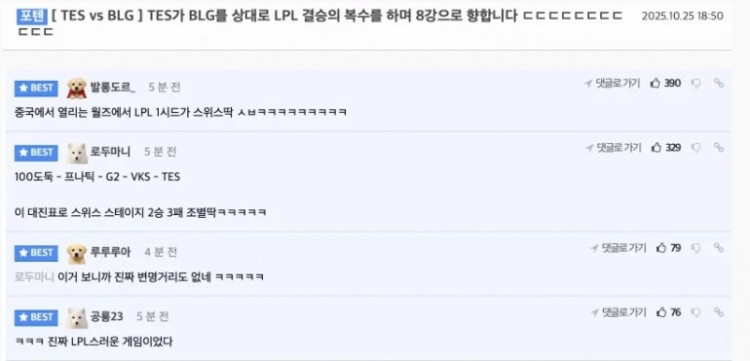 直播吧10月25日讯2025英雄联盟全球总决赛瑞士轮最后一轮TES以2比1战胜BLG晋级八强,韩国网友对此展开热议;
