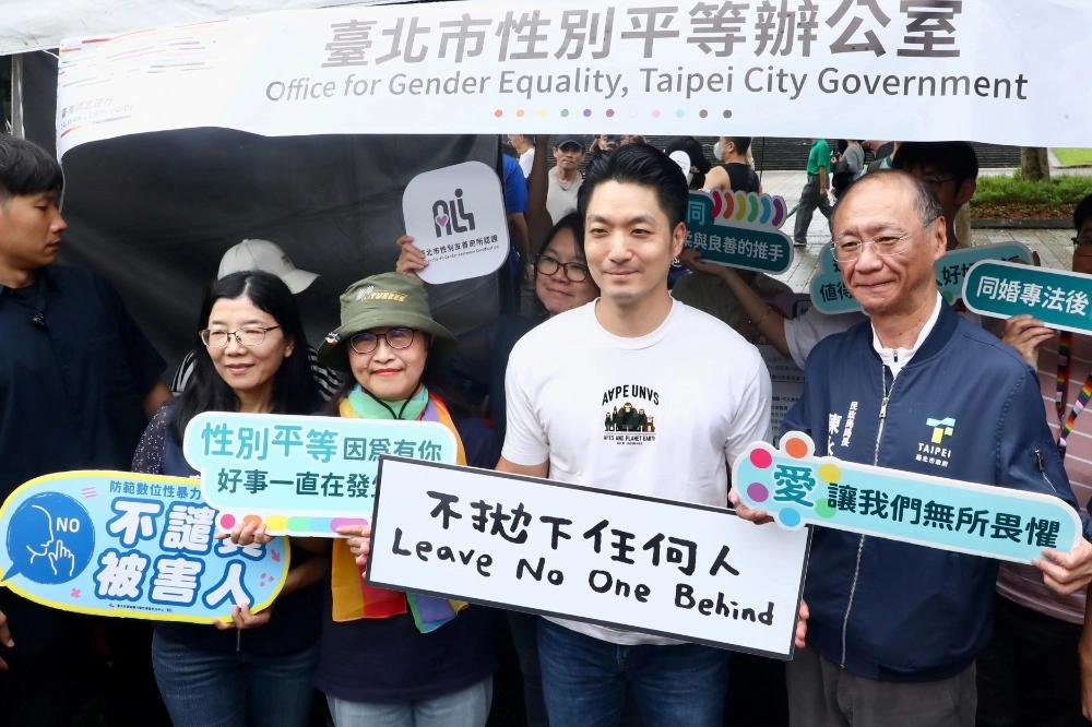 蒋万安今天也参加了“第23届台湾同志游行”,从后面的横幅可以看出,台北市竟然有一个“性别平等办公室”——这个办公室是干啥的?