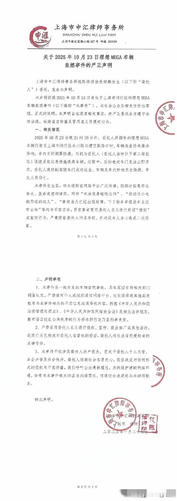 理想MEGA行驶中自燃,车主比李想还强势,已发律师函证明不存在车辆有磕碰、改装、故障。证明什么麒麟电池、白虎电池、青龙电池,无论如何字研,只要是锂电池,那就是不可靠的安全问题。 相比燃油车存在两大危及生命的问题,第一就是不碰撞也会出现无故自燃起火,无论是在停在商场还是行驶中。第二就是一旦起火,80%就是逃不了,因为速度太快几秒就大火覆盖全车。 自燃理想MEGA车主发律师函辟谣 上海起火自燃理想车主否认发生磕碰和改装 车主掷地有声的律师函,直接戳破了“车辆问题”的推诿可能。没有磕碰、没做改装、无故障预警,正常行驶中突发自燃,这样的情况谁能不心慌? 车企给电池起再多霸气名号,终究绕不开锂电池的本质特性。热失控的风险就像颗不定时炸弹,不是靠命名游戏就能消除的安全隐患。 有数据显示,新能源汽车自燃率虽低于燃油车,但起火速度是燃油车的数倍。多数锂电池起火从冒烟到全车燃烧仅需30秒,留给车主的逃生时间少得可怜。 燃油车起火多与碰撞、油路故障相关,无故自燃的案例极少。但新能源车的无故自燃,让车主连“规避风险”的方向都找不到,只能被动承受未知威胁。 消费者花大价钱买车,买的是便利更是安全。当“无故自燃”成为悬在头顶的利剑,再先进的配置、再酷炫的设计,都失去了意义。 车企不该只忙着给技术贴标签、造概念,更该把精力放在底层安全技术的打磨上。每一次自燃事件,都是对行业安全底线的拷问。 车主的强势维权,不仅是为自己讨公道,更是在为所有新能源车主发声。安全问题容不得含糊,更不能用“小概率事件”轻飘飘带过。 监管层面也该跟上步伐,建立更严格的安全标准和追溯机制。让每一次自燃都能查到根源,让车企真正重视安全,而不是事后公关。 新能源汽车的发展不能以牺牲安全为代价。技术迭代的同时,安全底线必须牢牢守住,这是行业长久发展的根本。 各位读者你们怎么看?欢迎在评论区讨论。