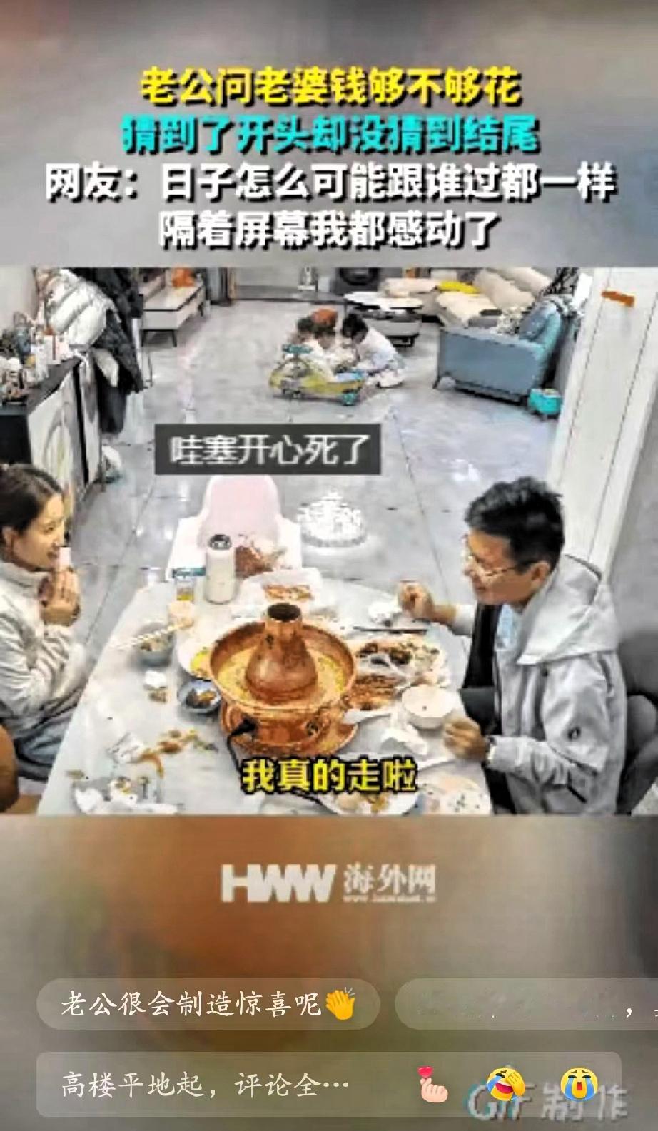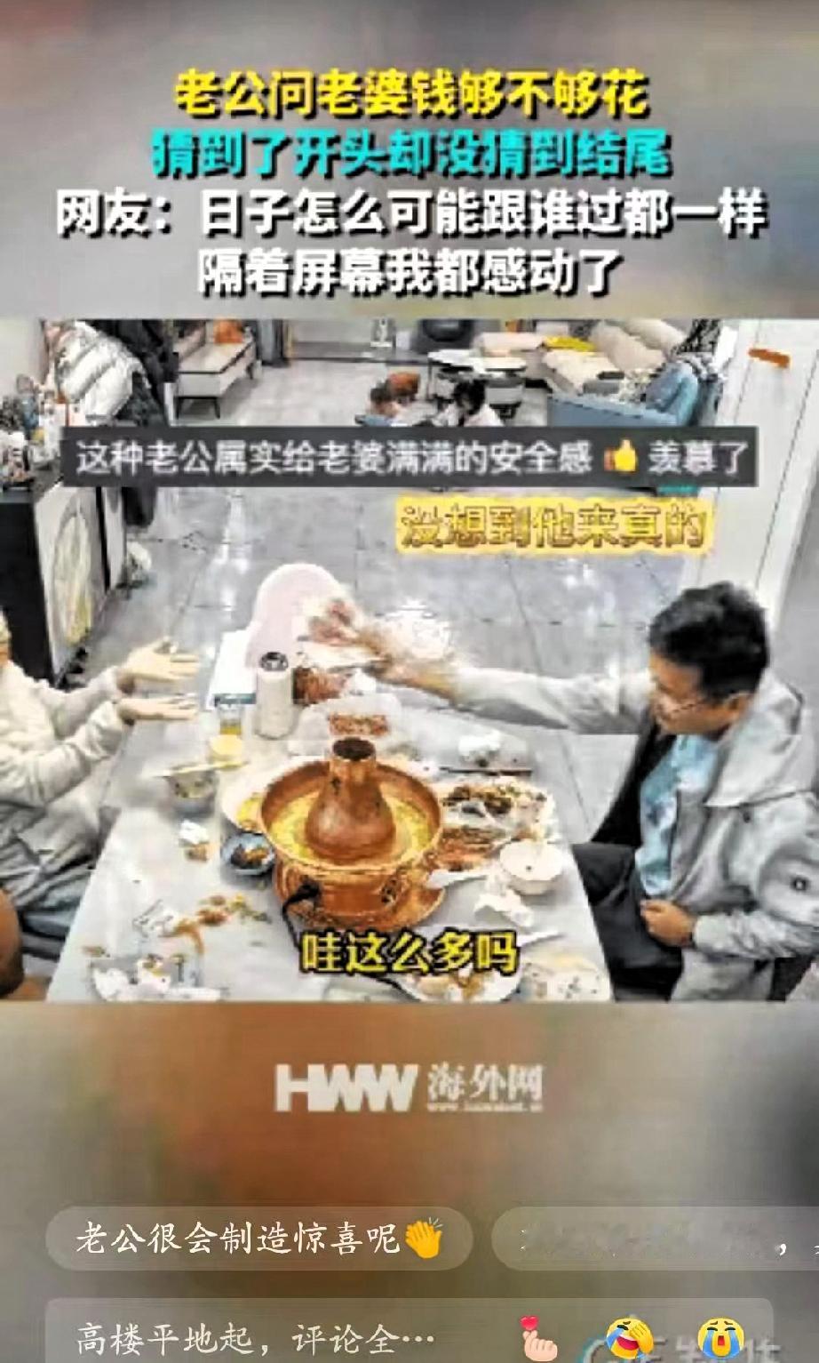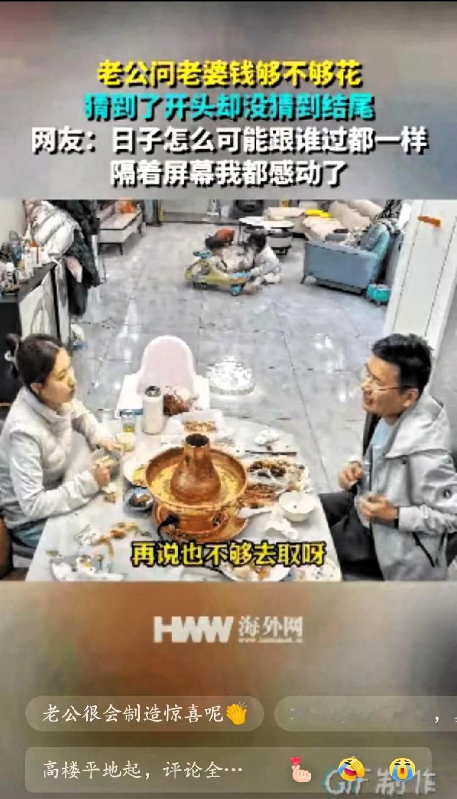 山东一女子和丈夫在桌子上吃饭,突然丈夫问她钱够不够花,女子一脸期待回答说:你要给我钱花呀! 老婆手里的筷子立马停了,眼睛瞬间亮起来,满是期待地盯着他的口袋,结果他慢悠悠摸出张纸巾,擦了擦嘴就淡定放下;老婆撇撇嘴有点小失落,低头扒了两口饭,没一会儿他又凑过来问“真不用添点?孩子换季还得买衣服呢”,这次老婆赶紧抬头,眼里又燃起希望,没想到他掏出来的竟是根牙签! 看着老婆又气又笑拍他胳膊的样子,他才嘿嘿一笑,从另个口袋里掏出两沓现金,往老婆面前一推:“早给你准备好了,就想逗逗你”。那瞬间老婆眼里的笑意,比桌上的菜还让人觉得暖! 别觉得这是“幼稚小把戏”,婚姻里最缺的就是这份“愿意花心思的在意”。现在好多人抱怨婚姻过成了白开水,说浪漫都是婚前的事,可浪漫哪是靠大牌礼物堆出来的?是记得你要给孩子买鞋、要囤家用,还想着用小玩笑让你开心;是你懂他的“小调皮”,他懂你的“小期待”,把柴米油盐的日子过出了烟火气的甜。 这种藏在细节里的惦记,比任何昂贵的礼物都踏实。你家那位有没有过这种“让人又气又爱”的小操作?
