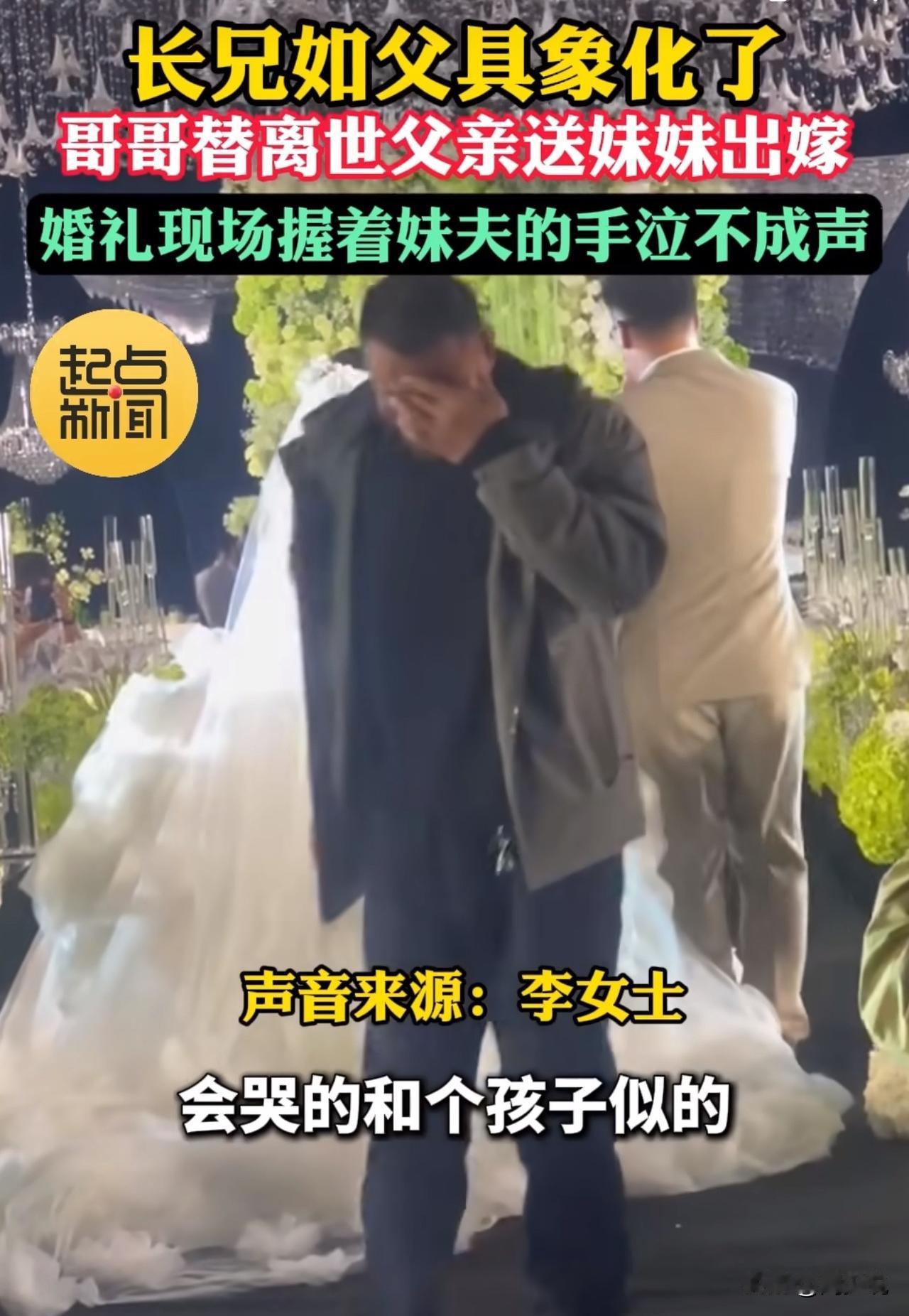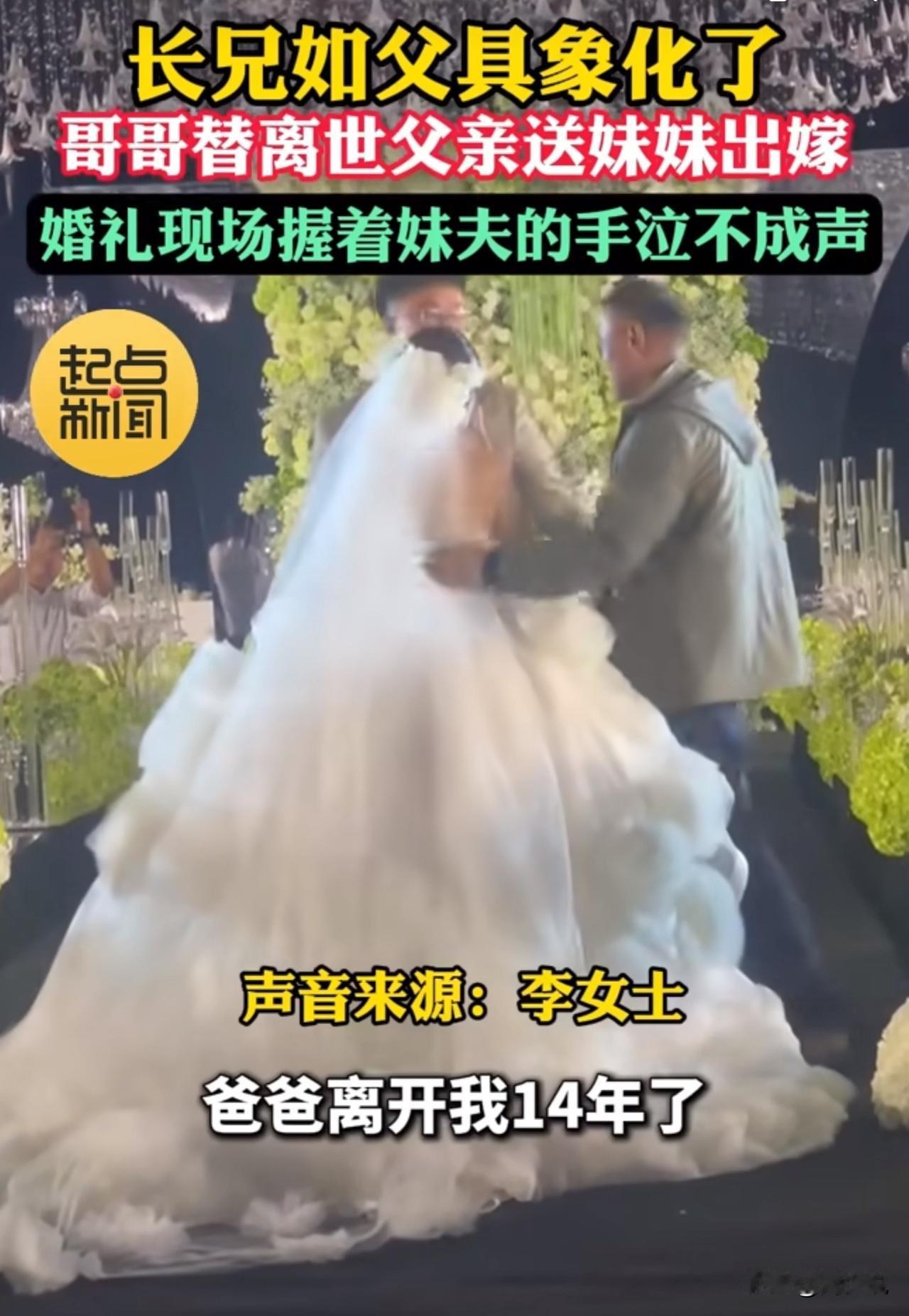 父亲离世14年,哥哥替父送妹出嫁哭成泪人,网友:这才是长兄如父! 近日,山东潍坊一场婚礼上,李女士的哥哥就用一个举动看哭无数人。 李女士的父亲已离世14年,婚礼当天,平日里不善言辞的哥哥代替父亲,牵着她走上红毯。当他把妹妹的手郑重交到妹夫手中时,这个常年撑起家庭的汉子再也绷不住,当场哭成了泪人。 据李女士说,父亲走后,哥哥一直照顾母亲、扛起家,从不说肉麻话,这场哭是她从未见过的模样。 视频曝光后,网友纷纷热议。有网友当即感叹:“这一刻终于懂了‘长兄如父’,是责任也是不舍”! 也有网友坦言:“哥哥的眼泪里全是牵挂,这才是最踏实的娘家后盾”。 比起仪式感,周少觉得家人的守护更动人。哥哥的眼泪里,藏着14年的责任与疼爱,也诠释了亲情最本真的模样。这样的家人,才是无论走多远都能安心依靠的港湾。 对于哥哥替离世父亲送妹妹出嫁哭成泪人,大家有被感动到吗?#寻美三湘# #长沙新朋友#