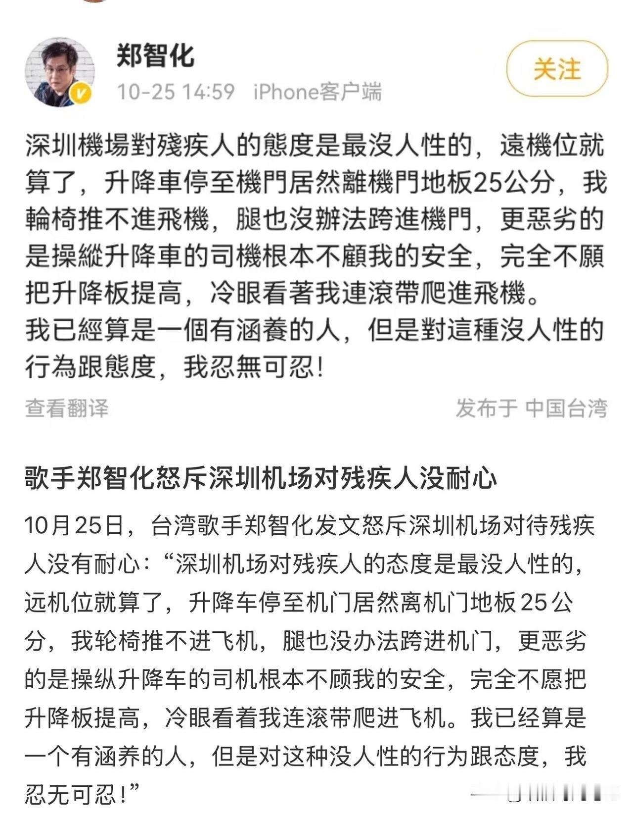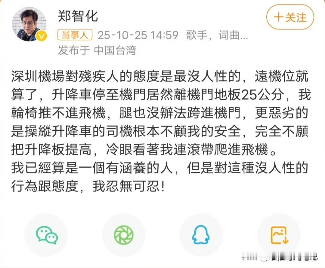 10月25日,深圳机场,唱《水手》的郑智化被25公分“小台阶”难倒。升降车司机全程冷眼旁观,直接把他晾在舱门口。轮椅过不去,双腿使不上劲,他只能把身体当船桨,硬“划”进飞机。 现场没人搭把手,空姐空少不敢擅自抬,地勤怕担责,司机双手插兜看风景。短短十几秒,郑智化把“尴尬”写成了“羞辱”。 微博一发,评论区炸锅: “25公分,比珠穆朗玛峰还难翻。” “无障碍”三个字,为何在一线城市机场成了纸上谈兵? 机场秒回:已启动核查,马上优化。网友不买账:要不是明星,这声“对不起”会从天而降吗? 查了下,深圳机场去年旅客吞吐量5000多万人次,无障碍通道、升降平台、特殊旅客服务中心一应俱全。 硬件满分,软件掉链子——工作人员的全程视若无睹,就把所有制度打回原形。 说到底,还是“没把人当回事”。 郑智化说:“我不是身体痛,是心里寒。” 这句话,像一巴掌扇在所有“无障碍设施”招牌上: 盲道被占用、坡道陡成滑梯、电梯里堆杂物…… 城市拼命刷新颜值,却在细节里把一部分人拒之门外。 别忘了,我们每个人都会老,都可能拄拐、推轮椅、抱娃、拖行李。 无障碍不是“少数人的福利”,是“未来的自己”能不能好好出门的保险。 别让“25公分”成为城市的良心缺口。 你遇到过哪些“看似有却用不了”的无障碍设施?如果是你在现场,会伸手帮一把吗?评论区聊聊! [图源网络]