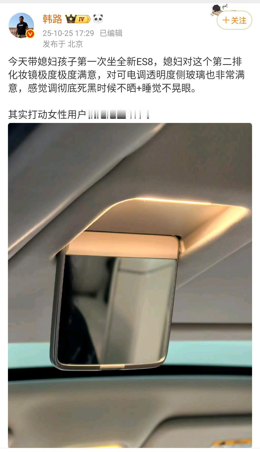 韩路:今天带媳妇孩子第一次坐全新ES8,媳妇对这个第二排化妆镜极度极度满意,对可电调透明度侧玻璃也非常满意,感觉调彻底死黑时候不晒+睡觉不晃眼。其实打动女性用户就是这些细节! 买车的时候这些不是关键的,但是在使用中这些东西都是关键的细节点,肯定不会有人因为化妆镜好用就买一台车。 因为一台车好发现了一台车很多非常巧妙的设计,这是非常正常的一件事情,特别是国产新势力比较靠前的几名,他们的车型都发展到几代了,所以对很多原有的设计都有不同的见解。 各位是怎么看的?欢迎评论区留言。