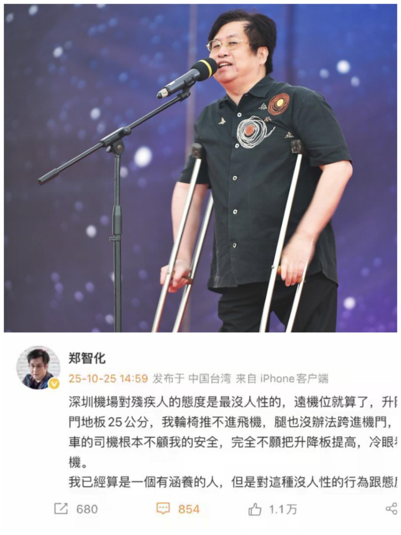 郑智化连滚带爬进飞机,在深圳机场骂街,25公分落差摔碎的何止尊严?郑智化的怒吼该叫醒谁? 唱“风雨中这点痛算什么”的郑智化,居然在深圳机场被25公分台阶难住了!坐着轮椅想登机,轮椅推不上去,喊升降车司机帮忙,人家还爱答不理,气得他直说“这也太没人情味了”! 这25公分看着不高,事儿可不小——民航局早说过机场得弄好无障碍设施,这明显没做到;更气人的是司机那态度,比台阶还让人膈应。机场倒是道歉快,可一句“下次提前申请”,这不就是甩锅吗?合着残疾人出门,还得先跟机场报备? 郑智化这事真不是独一份。李琛说自己也遇过,网友更吐槽:盲道被电动车占了,无障碍厕所锁着门,这不都是常事?全国8500万残疾人,出门就怕这些“看着方便、实则没用”的摆设。 城市好不好,真不是看楼多高,是看能不能让老人、残疾人好好走路。这25公分的坎,早该用规矩补好,用点心填平——不然哪天咱爸妈老了、自己摔着了,难道也得在原地干着急? 郑智化 机场