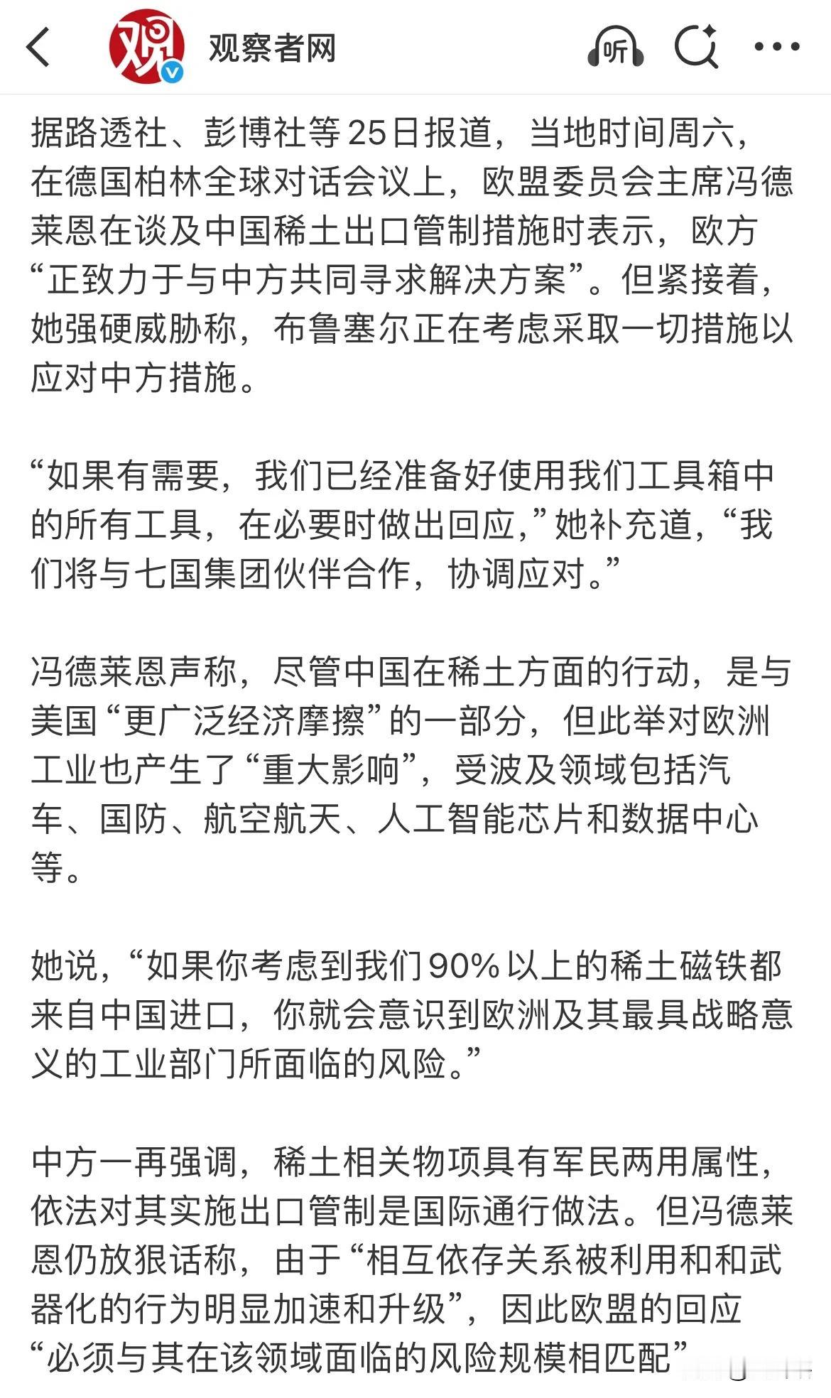 【冯德莱恩称欧盟将联合七国集团应对稀土问题】 欧盟主席冯德莱恩在德国一场会议上发出威胁,如果欧盟无法在稀土问题得到解决方案,欧盟将把工具箱里的所有可用工具对中国作出回应。 冯德莱恩还表示,欧盟将联合七国集团一道共同协商应对中国稀土出口管控措施。 显然,欧盟已经急的像热锅上的蚂蚁,欧盟90%的稀土依赖于中国出口,涉及行业之广,证明中国的反制效果已经出现明显成效,是非常对的。