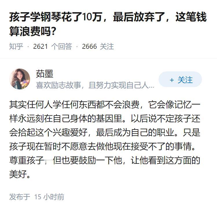 孩子学钢琴花了10万,最后放弃了,这笔钱算浪费吗?
