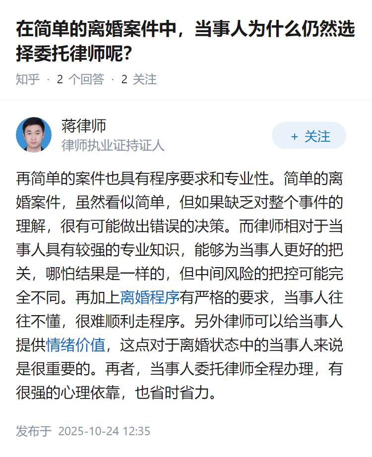 在简单的离婚案件中,当事人为什么仍然选择委托律师呢?