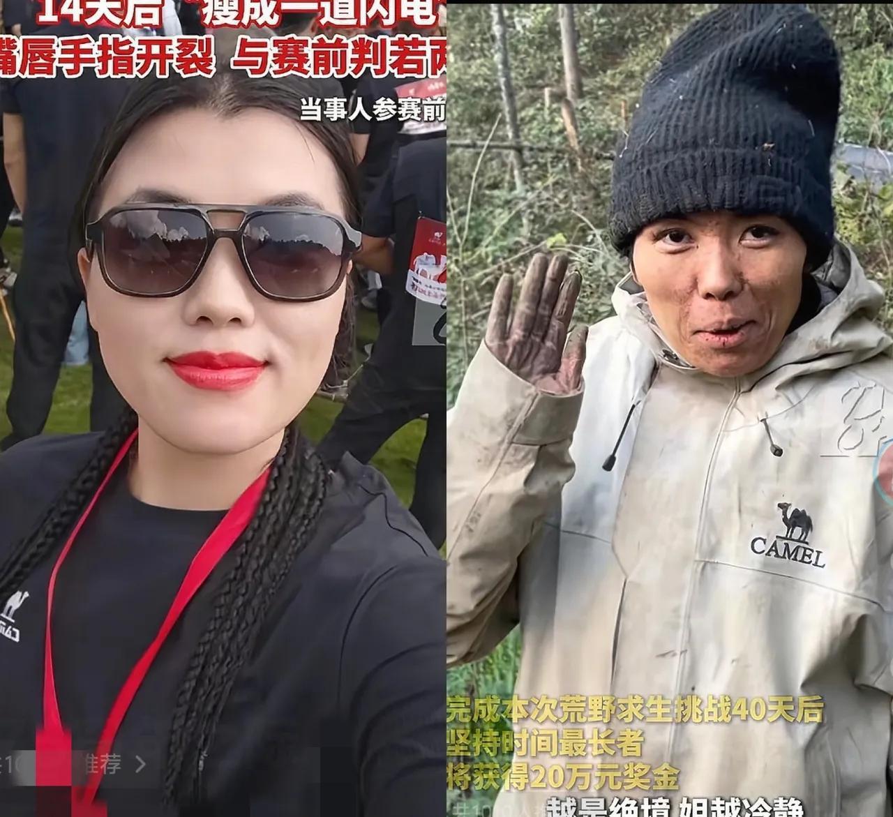 这姐们也太狠了!为拿20万奖金,参加湖南荒野求生挑战,14天就瘦成“闪电”,嘴唇手指全裂了,她还是目前唯一留守的女挑战者 100人开局只带一把柴刀,到10月24日只剩25人在扛。网友调侃得实在,再精致的人,像在农村夏秋干俩月活,也得变“土气”。 这哪是挑战荒野,更是对毅力的考验!不过拿健康换奖金,值不值真得好好掂量。你要是有这机会,会去闯一闯吗?