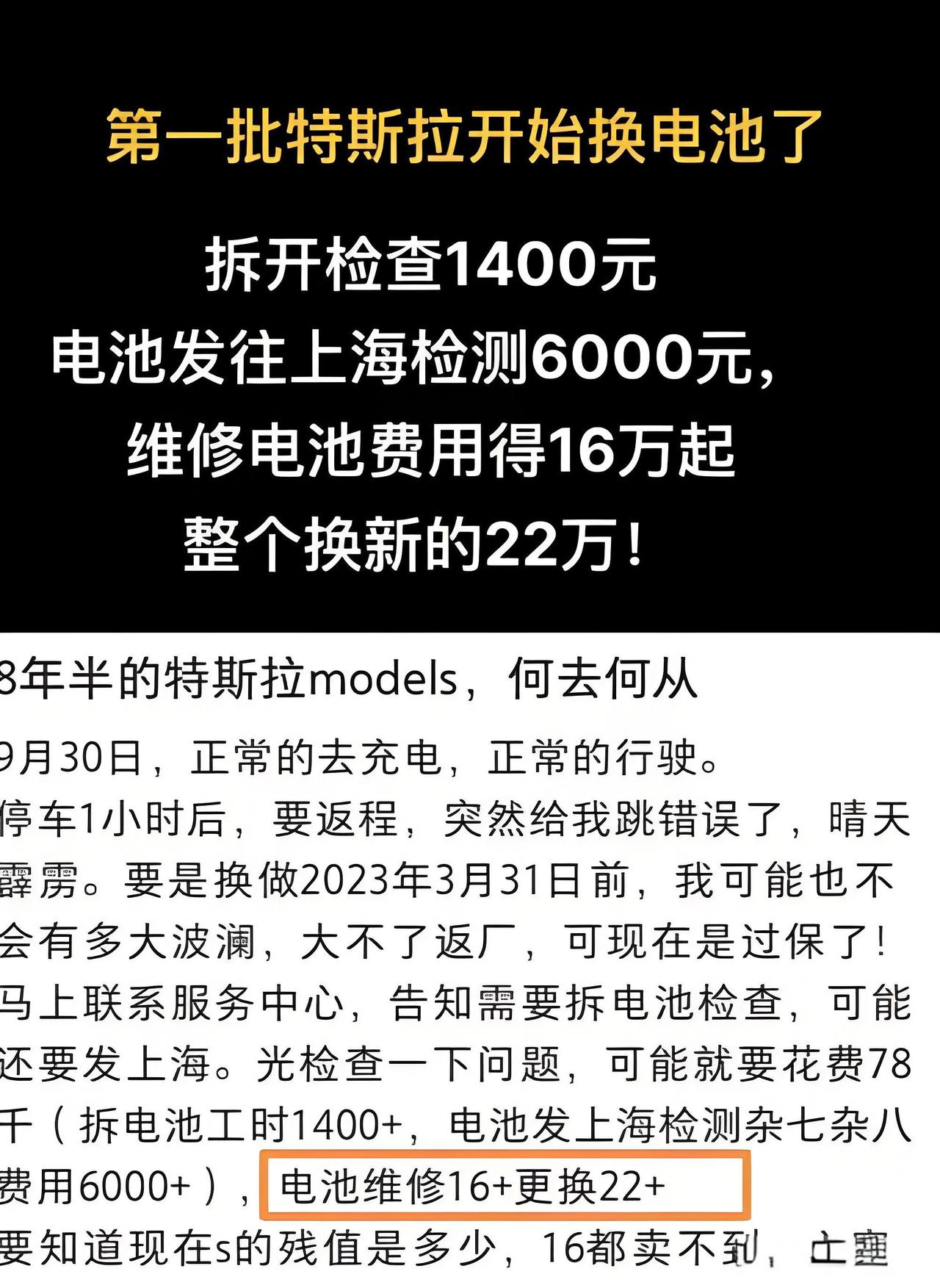 当年吹 “十年省十万油钱”, 现在一次换电倒贴18万!第一批特斯拉车主成了韭菜? 这话戳中了第一批特斯拉车主的痛处!当年销售吹“十年省十万油钱”,结果现在换电池的账单直接把人砸懵,说他们是韭菜真不冤。 上海有位Model S车主,车开8年半,换电池报价22万,可车子残值才15万,修比买新车还亏 。深圳一位Model 3车主更崩溃,换电池要14万多,车才值10万 。 更坑的是质保套路,续航掉一半,4S店还说没到70%衰减标准不给免费换 。当年省的油钱,如今全倒贴进去还不够,这账算下来太憋屈!